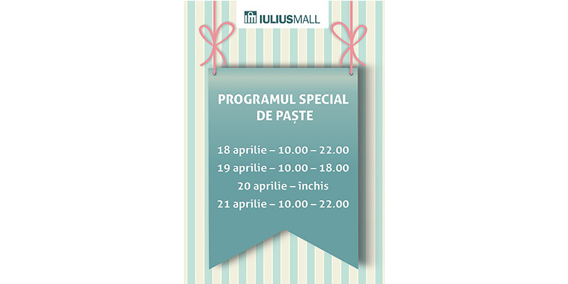 Sambata, 19 aprilie 2014, cei care doresc sa se innoiasca cu articole in tendinte sau cei care mai au de finalizat lista de cumparaturi pentru masa dedicata Sarbatorile Pascale pot vizita magazinele din Iulius Mall in intervalul orar 10.00 – 18.00. Duminica, in prima zi de Paste, mall-ul este inchis, insa cei care vor sa petreaca a doua zi de Paste in cafenele sau imbogatindu-si garderoba din noile colectii ale brandurilor din Iulius Mall o pot face dupa programul obisnuit, in intervalul 10.00 – 22.00.