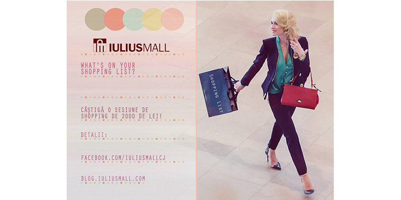 Pana pe 18 aprilie 2014, prietenii de pe pagina de Facebook ai Iulius Mall Cluj sunt invitati sa participe la concursul „What's on your shopping list?”. Concurentii trebuie sa faca o lista de cumparaturi pentru ei si perechea lor de shopping, pe care sa o fotografieze si sa o expedieze pe adresa [email protected]. Apoi vor da „share” afisului aferent concursului de pe pagina de Facebook si vor da „tag” persoanei care ii va insoti la cumparaturi. In ultima zi a concursului, prin tragere la sorti, va fi desemnat castigatorul marelui premiu: o sesiune de shopping in valoare de 2.000 de lei.