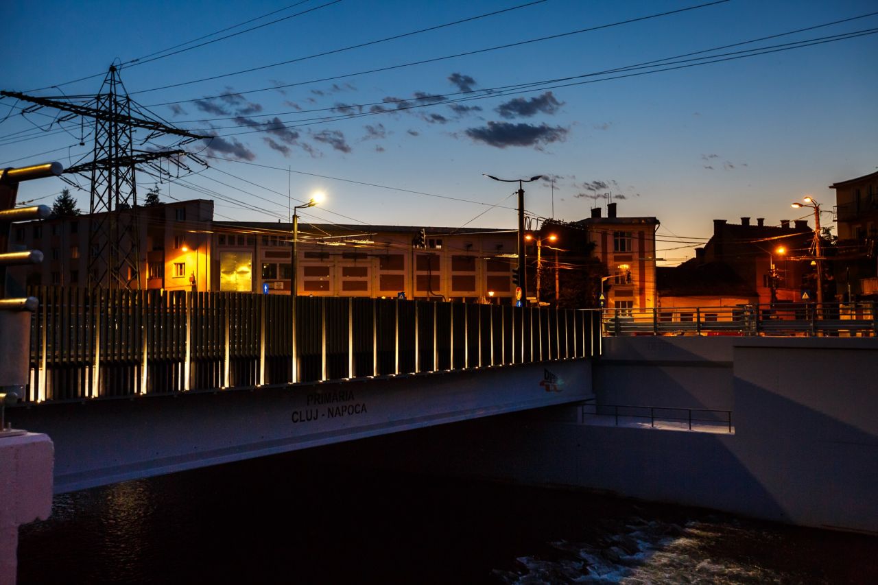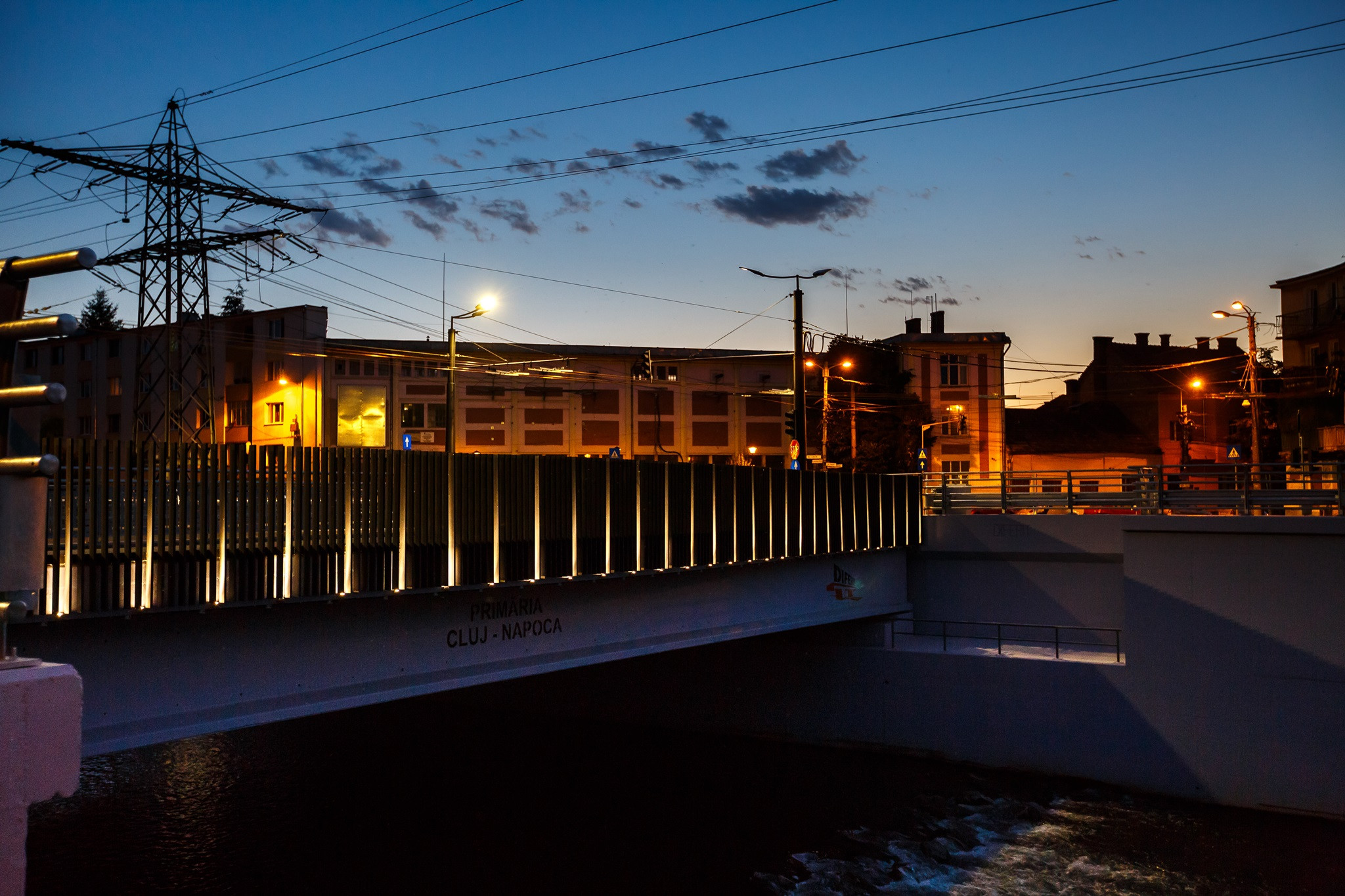 Iluminatul arhitectural ofera o imagine feerica structurii podului dupa lasarea serii.