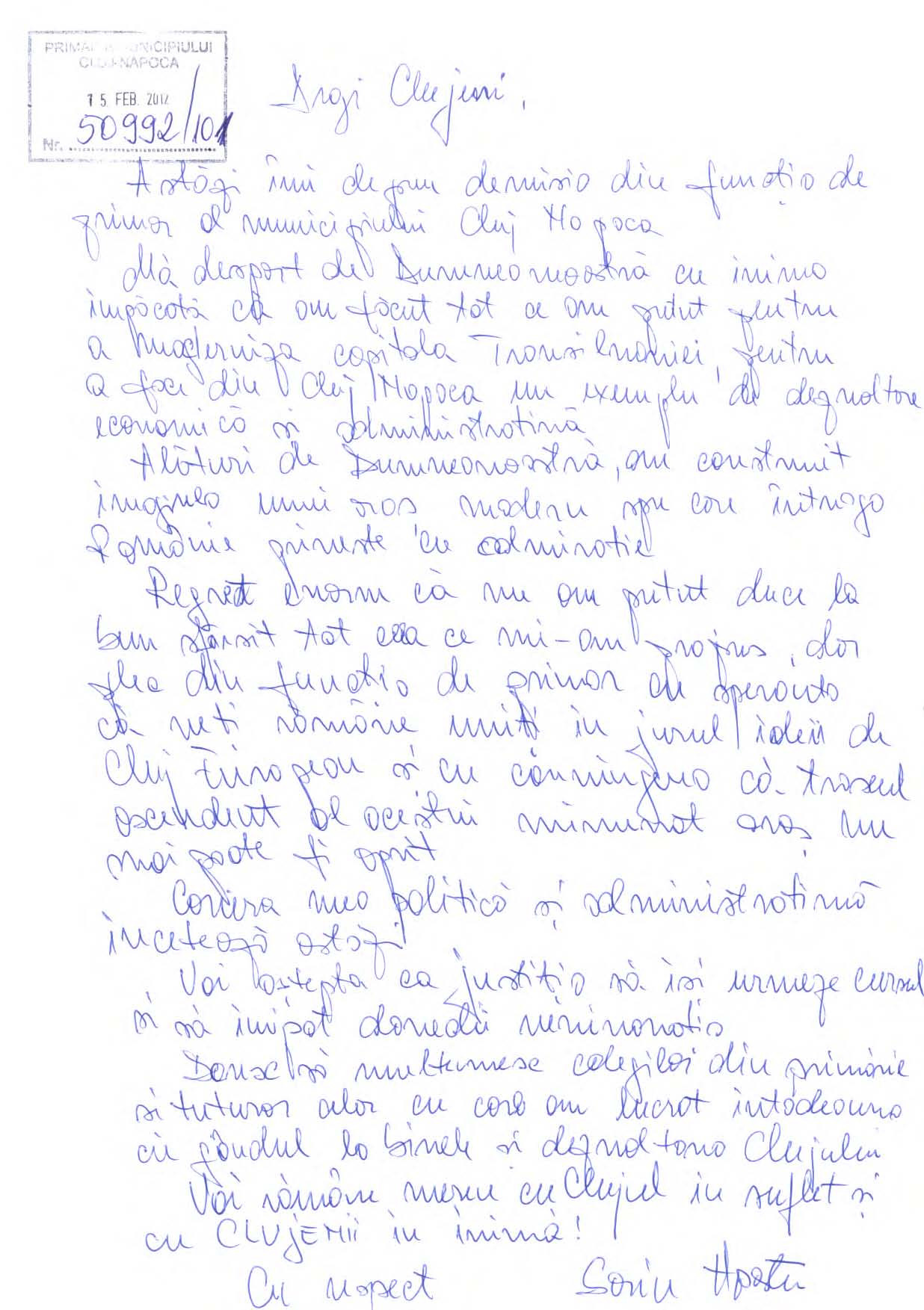 Demisia primarului arestat a ajuns la sediul municipalității de la Penitenciarul Gherla. „Astăzi, 15 februarie 2012, ora 16.19, a fost inregistrata la Primaria municipiului Cluj-Napoca cererea de demisie din functie a primarului Sorin Apostu. Alăturat, vă înaintăm scrisoarea deschisă a domnului primar Sorin Apostu către locuitorii municipiului Cluj-Napoca, document înregistrat la ora 16.20 la Centrul de Informare pentru Cetăţeni al Primăriei Cluj-Napoca”, spun reprezentanții municipalității.