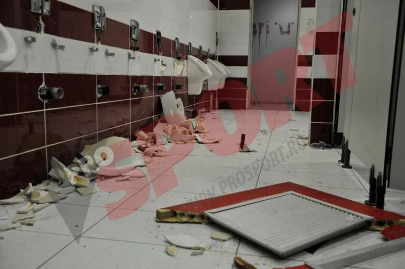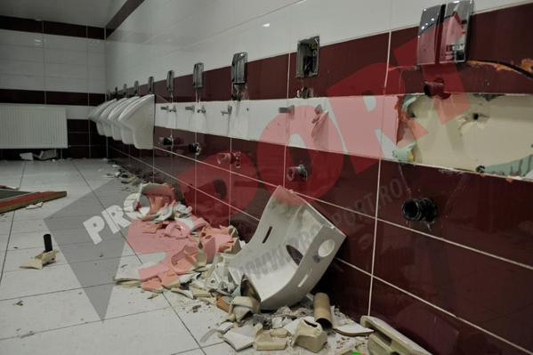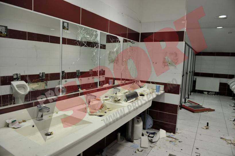 Fanii au spart chiuvetele, oglinzile si vasele de toaleta, iar in urma lor a ramas un dezastru greu de descris. Incidentele s-au petrecut mai ales in pauza meciului.