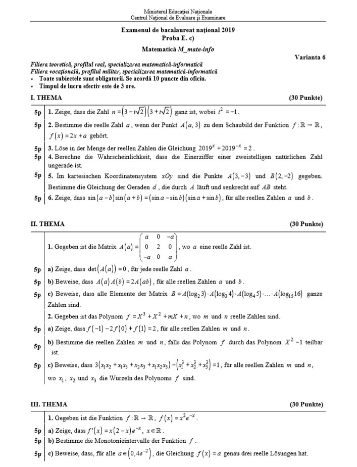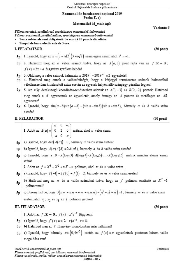 UPDATE Elevii de la mate-info (M1) au avut de rezolvat exerciții cu o matrice și un polinom. La al treilea subiect au primit un exercițiu cu monotonia unei funcții și o integrală