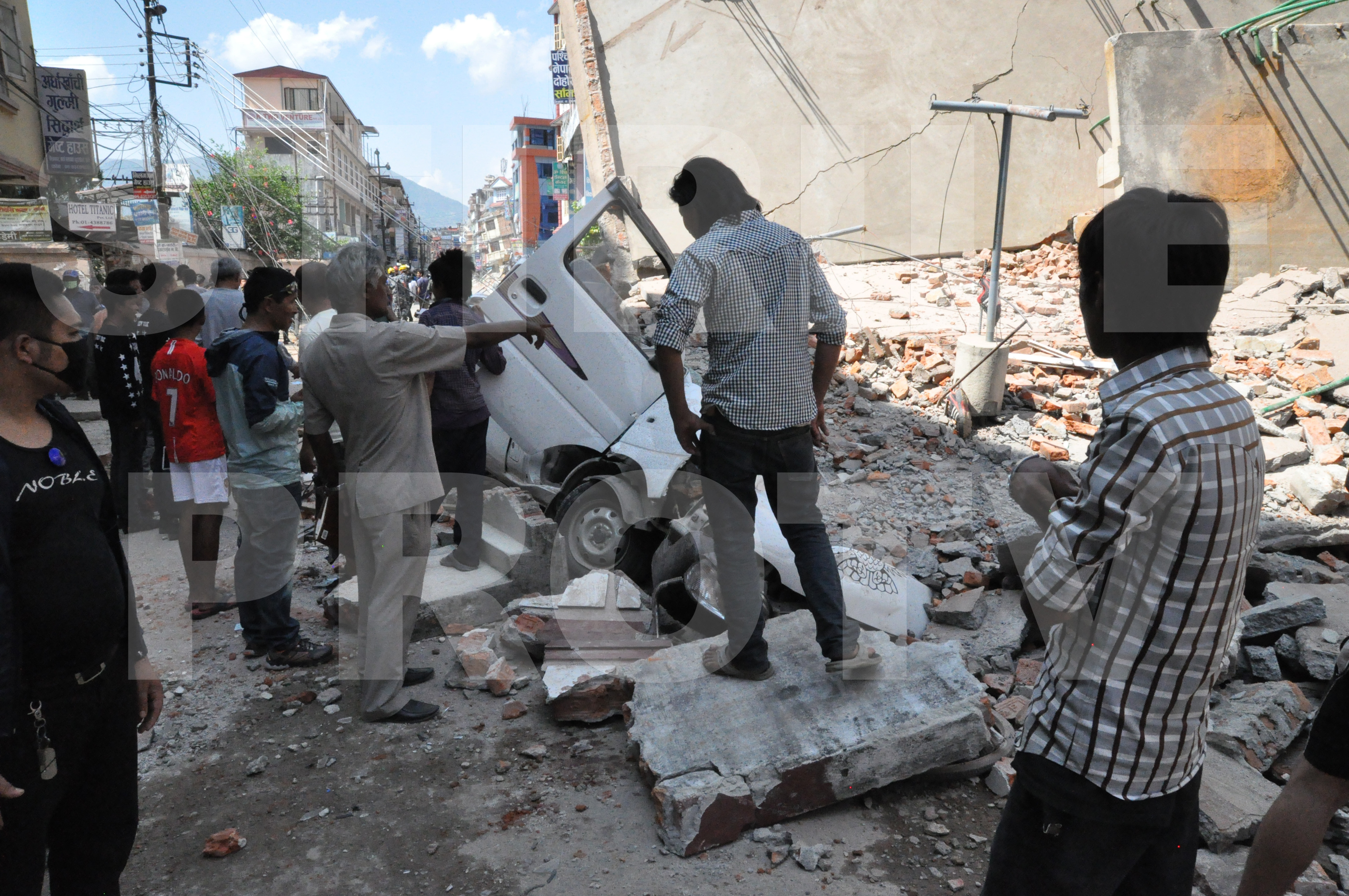 Dupa aceste momente, noi am pornit din nou la drum si am ajuns intr-un cartier din nord-vestul orasului, langa o statie de autobuze, unde stiam de acum 2 zile ca era locul cu cele mai multe cladiri daramate de cutremurul din 25 aprilie. In timp ce mergeam spre aceste cladiri a mai avut loc o replica, oamenii au inceput iar sa fuga si sa incerce sa ajunga in mijlocul strazii. Dupa aceea, nimeni n-a mai avut curajul sa ajunga inauntru, moment in care noi ne-am continuat drumul spre acele cladiri. Pe una dintre stradute am observat 3 alte blocuri cu 4 si 6 etaje care se prabusisera.