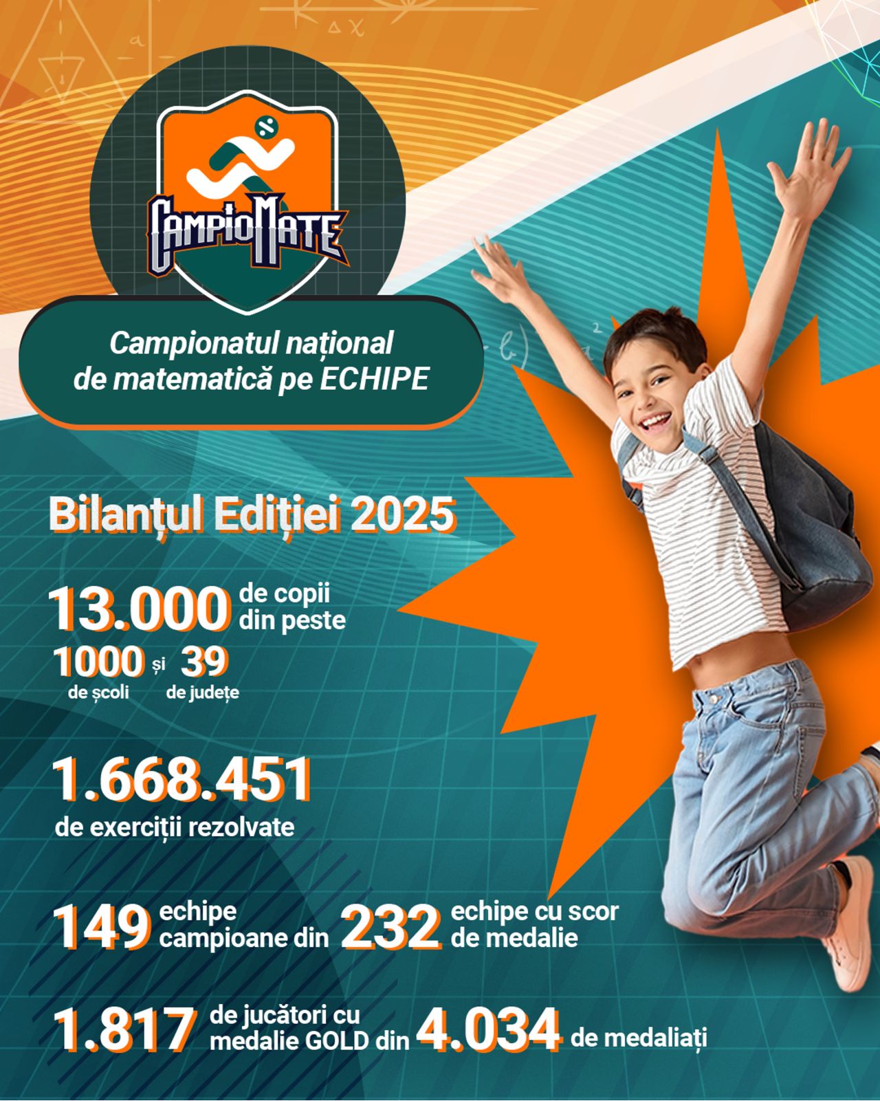 București, 3 iunie 2025 – Ediția 2025 a CampioMATE - competiție națională de matematică pe echipe, inspirată din gaming și sport și dedicată elevilor de gimnaziu - s-a încheiat, marcând un număr record de participanți și o mobilizare excepțională din partea profesorilor, elevilor și voluntarilor și demonstrând cât de atractivă poate fi matematica atunci când este adusă în terenul preferat al copiilor: cel al jocului, prieteniei și competiției.