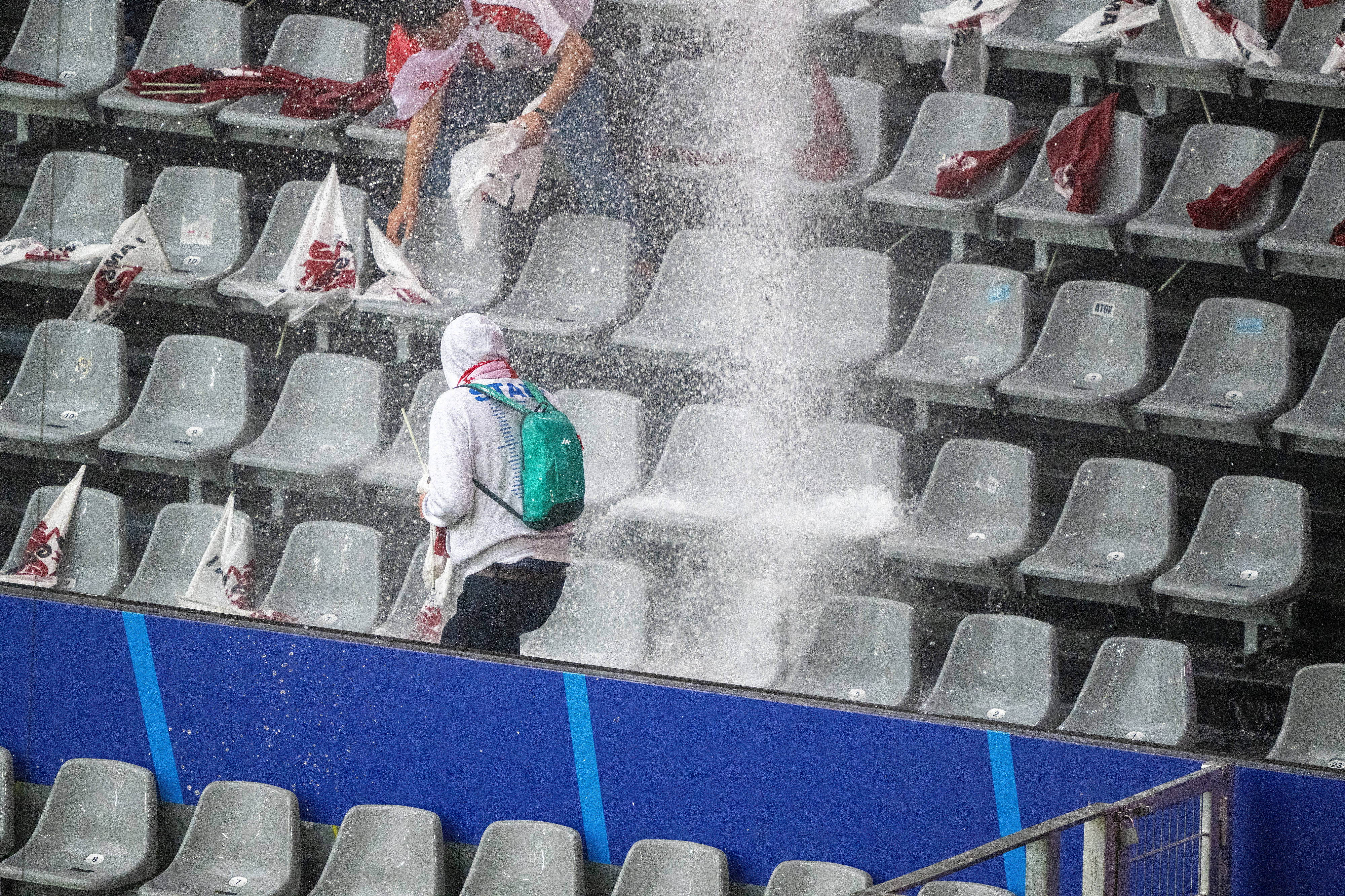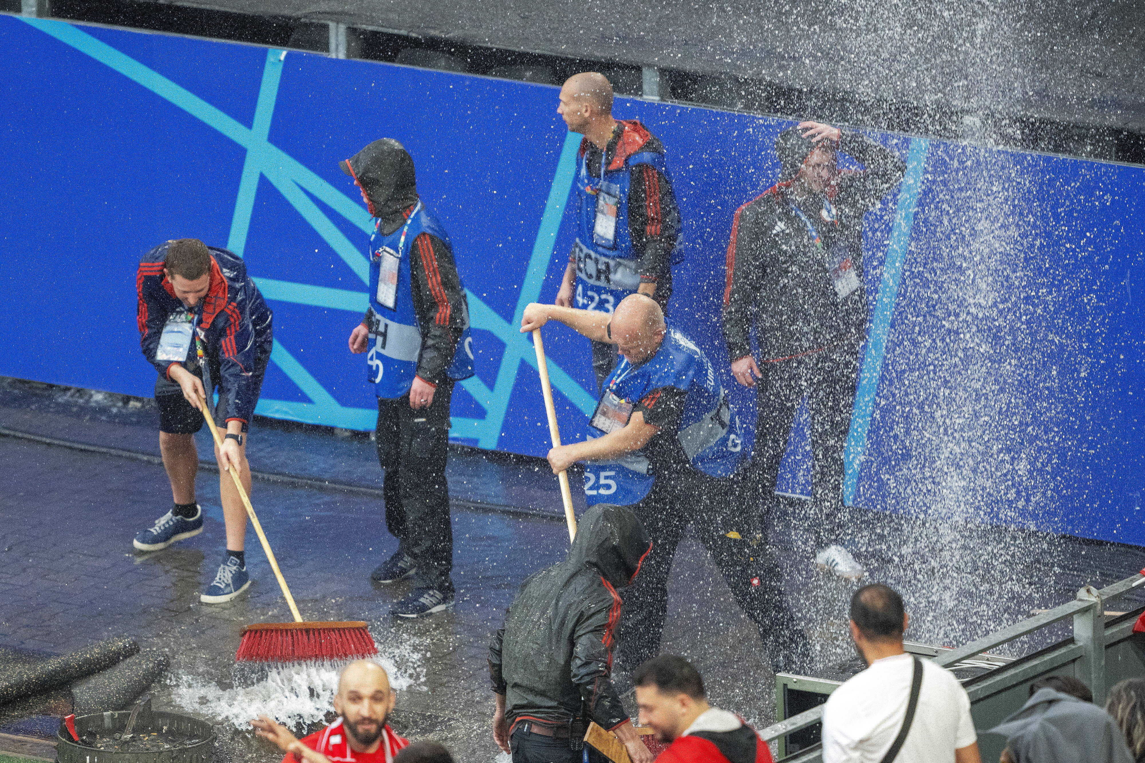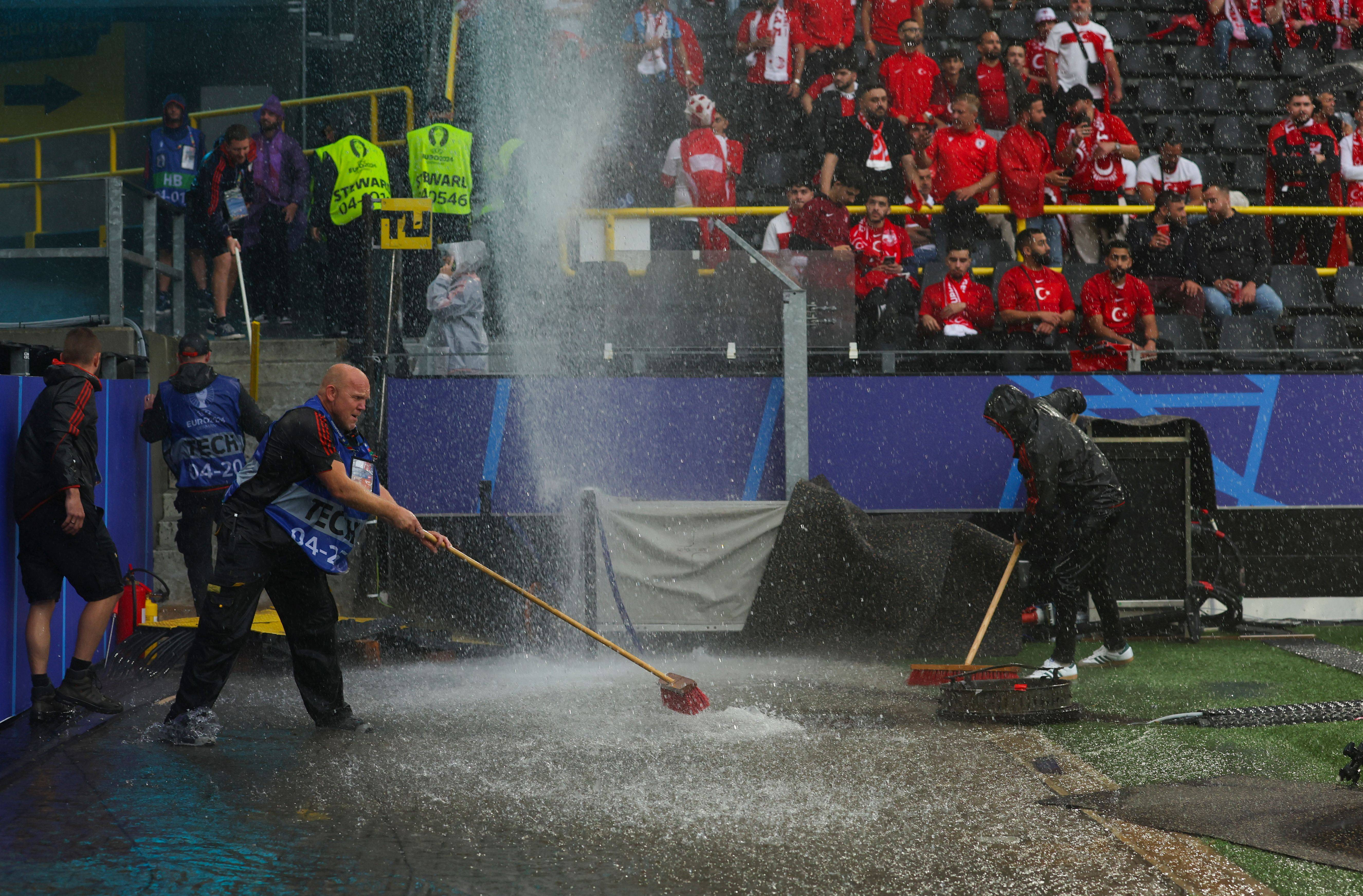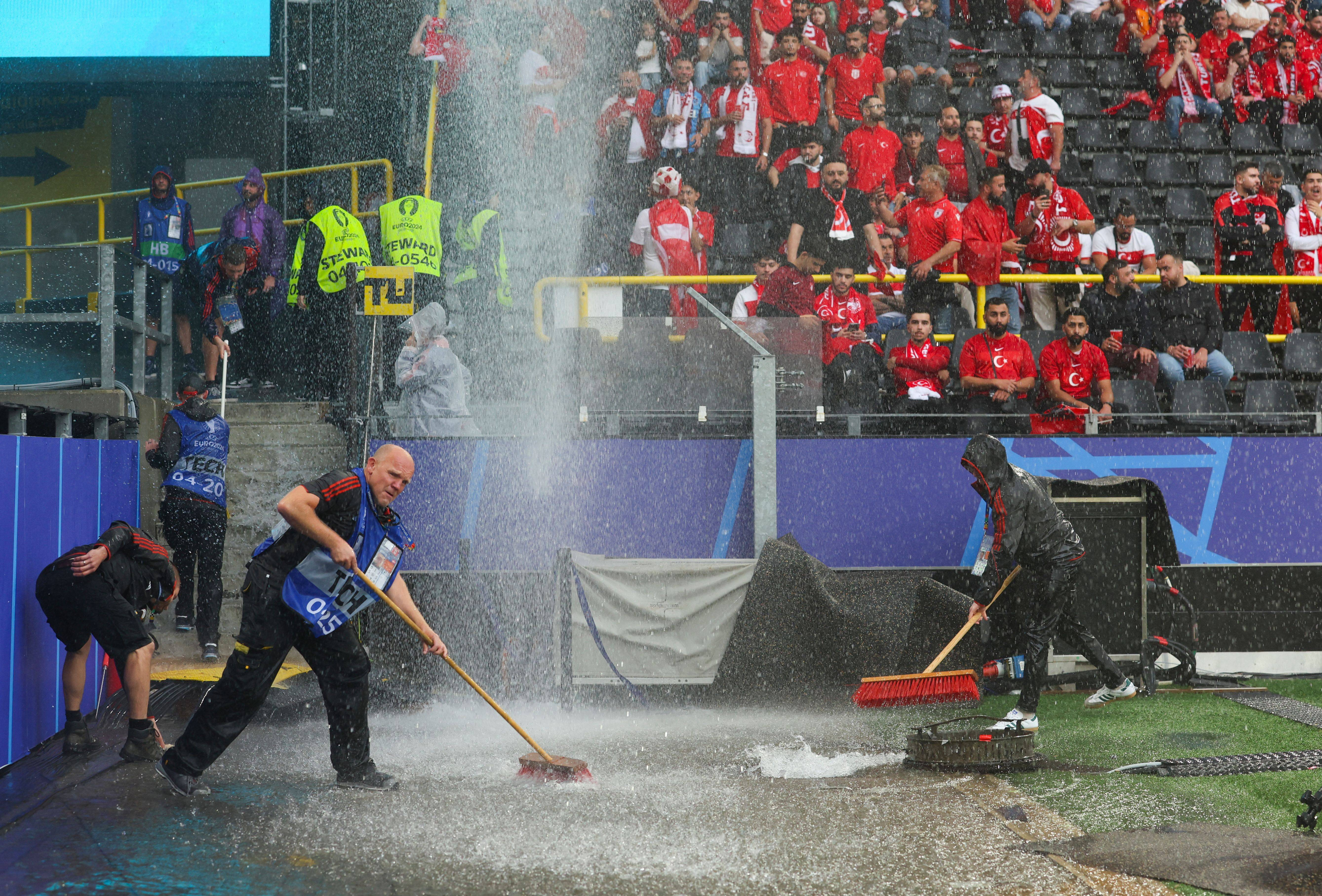 ????????️ The rain is so heavy at the Türkiye ve Georgia match that the staff are trying to sweep water into the drains. #EURO2024 pic.twitter.com/dsxMr80mgG