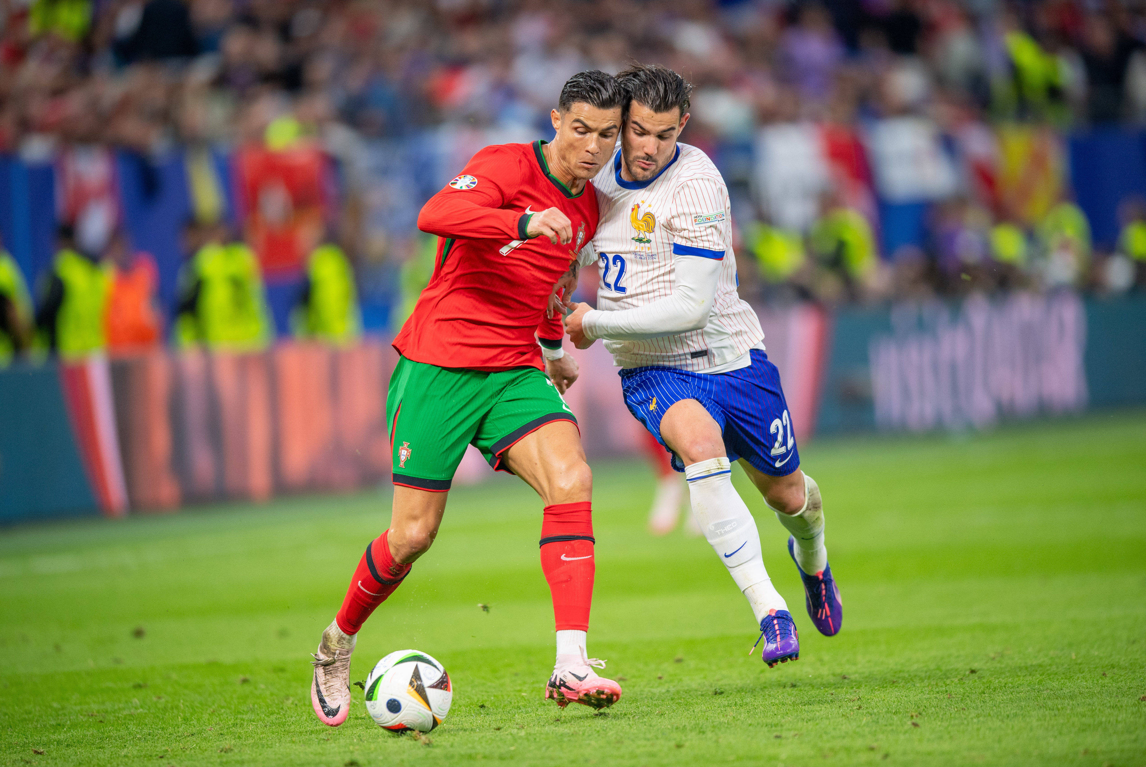 Min. 20 Theo Hernandez își încearcă norocul cu un șut puternic de la distanță, de 127km/h, dar Diogo Costa apără, iar portughezii înlătură pericolul.