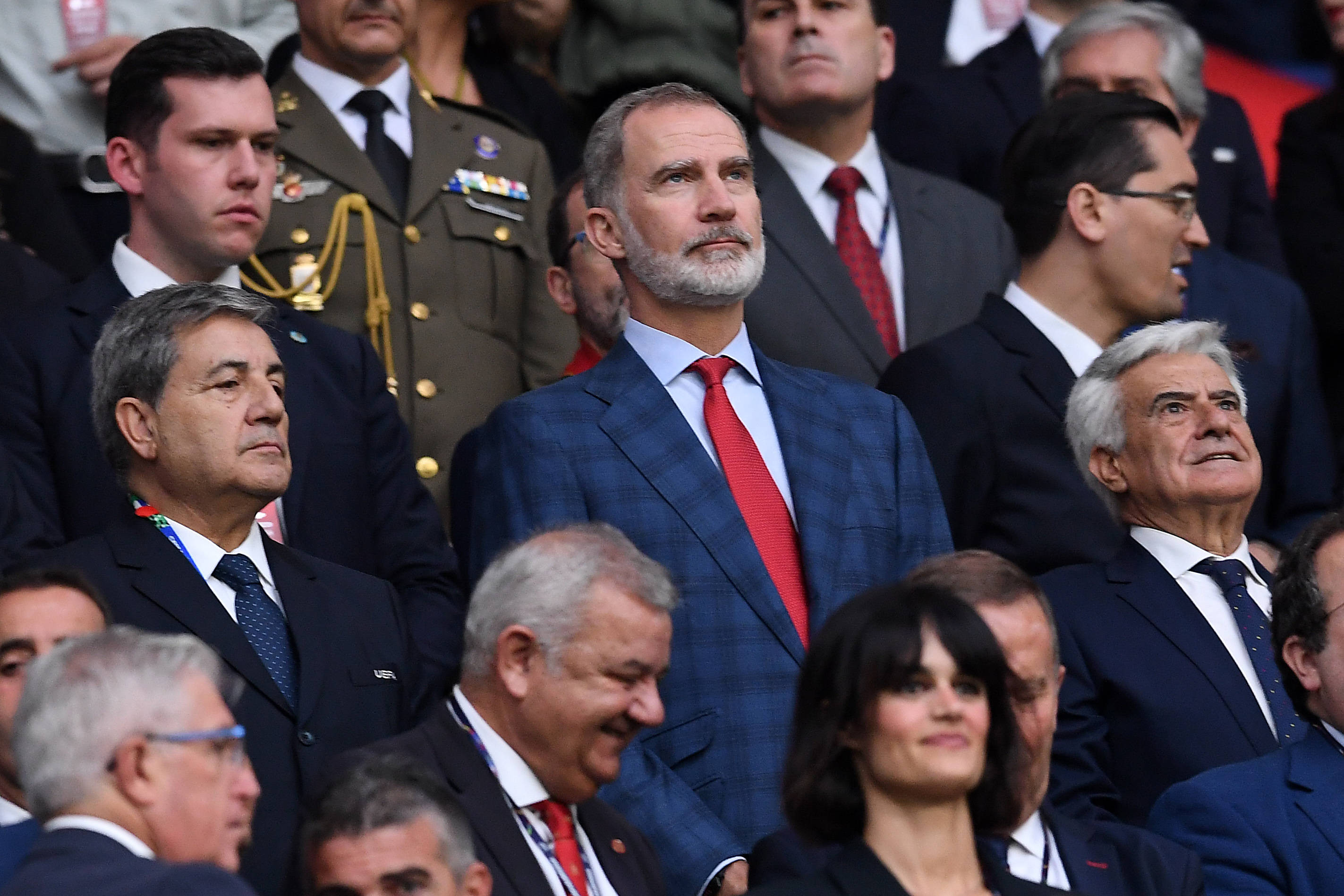 În tribuna oficială, în drepta Regelui Felipe al Spaniei poate fi văzut și Răzvan Burleanu, președintele Federației Române de Fotbal.