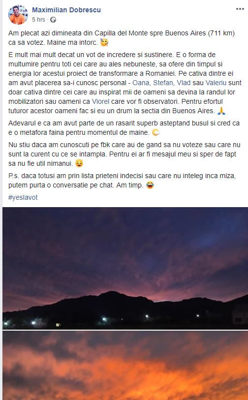 ”Am plecat azi dimineata din Capilla del Monte spre Buenos Aires (711 km) ca sa votez. Maine ma intorc. E mult mai mult decat un vot de incredere si sustinere. E o forma de multumire pentru toti cei care au ales nebuneste sa ofere din timpul si energia lor acestui proiect de transformare a Romaniei. Pe cativa dintre ei am avut placerea sa-i cunosc personal - Oana, Stefan, Vlad sau Valeriu sunt doar cativa dintre cei care au inspirat mii de oameni sa devina la randul lor mobilizatori sau oameni ca Viorel care vor fi observatori. Pentru efortul tuturor acestor oameni fac si eu un drum la sectia din Buenos Aires....Daca totusi am prin lista prieteni indecisi sau care nu inteleg inca miza, putem purta o conversatie pe chat. Am timp.” este mesajul publicat de român pe Facebook.