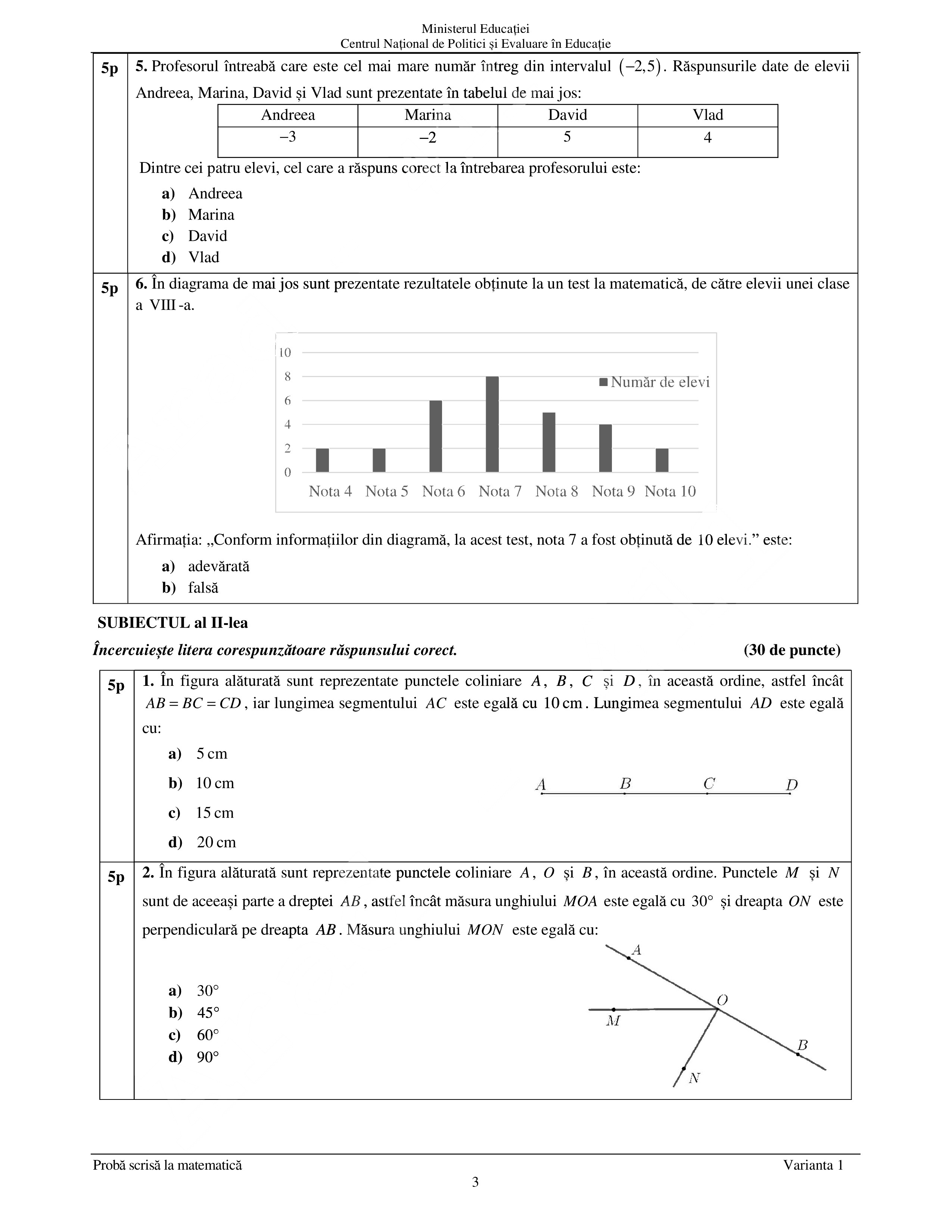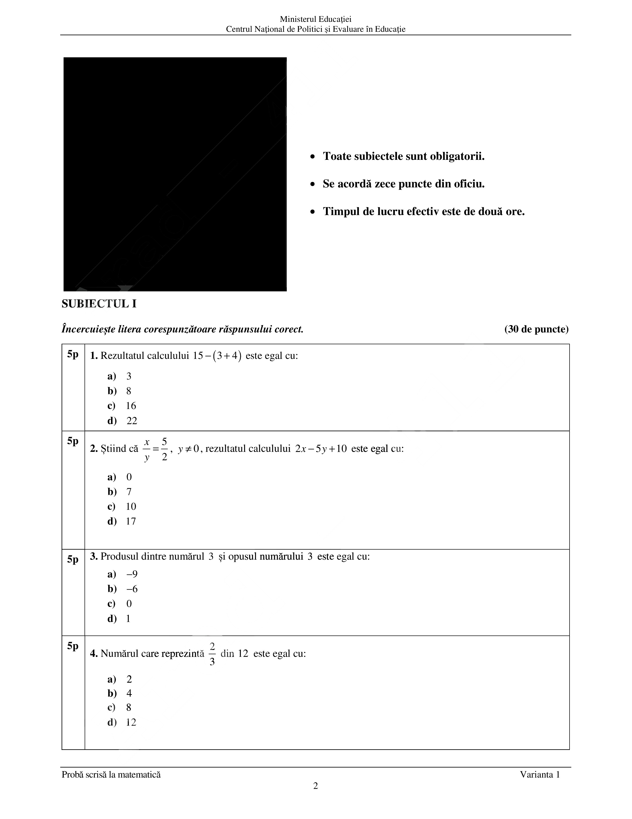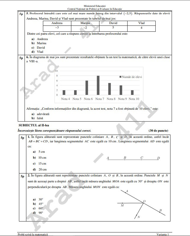 Examenul la matematică este structurat în trei subiecte. Fiecare subiect valorează 30 de puncte. Vor fi acordate 10 puncte din oficiu.