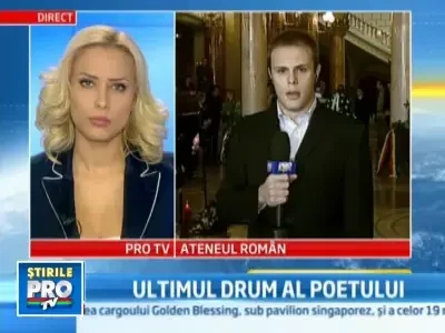 12.46 Sicriul cu trupul neinsufletit al lui Adrian Paunescu a fost scos din Ateneul Roman, unde a fost depus sambata seara, in aplauzele celor veniti sa-si ia ramas bun de la poet. In acelasi timp, zeci de persoane cantau imnul Universitatii Craiova "Oltenia, eterna Terranova", iar o femeie a intonat apoi "Desteapta-te, romane". Oamenii au aruncat cu flori spre cortegiu.