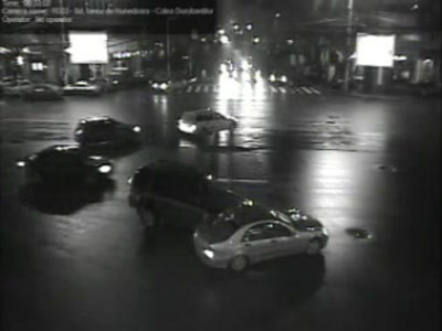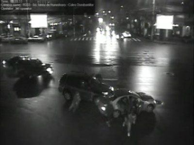 Din imaginile surprinse de o camera de supraveghere la intersectia strazilor Iancu de Hunedoara cu Dorobanti, se vede cum masina argintie in care se afla hotii incetineste, incercand sa-si faca loc in trafic.