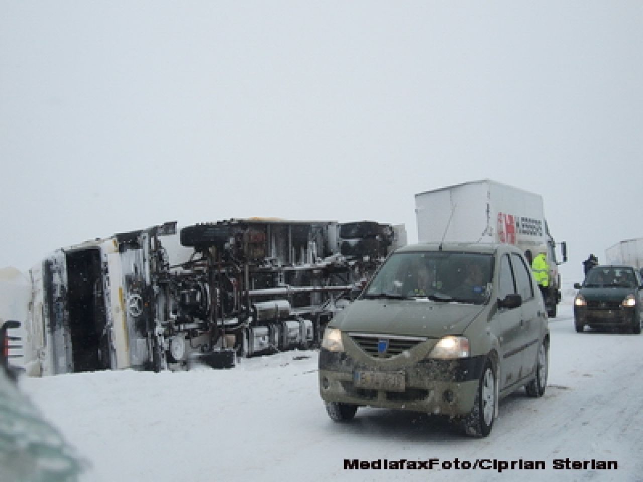 In acest timp, la granita dintre Buzau si Galati drumarii incercau sa deschida un drum inchis de vifor de 32 de ore. La cativa kilometri distanta, o ambulanta incerca zadarnic sa ajunga la o gravida in pericol. Echipajul a ajuns dupa doua ore la tanara, abia dupa ce utilajele pentru deszapezire i-au deschis drumul.