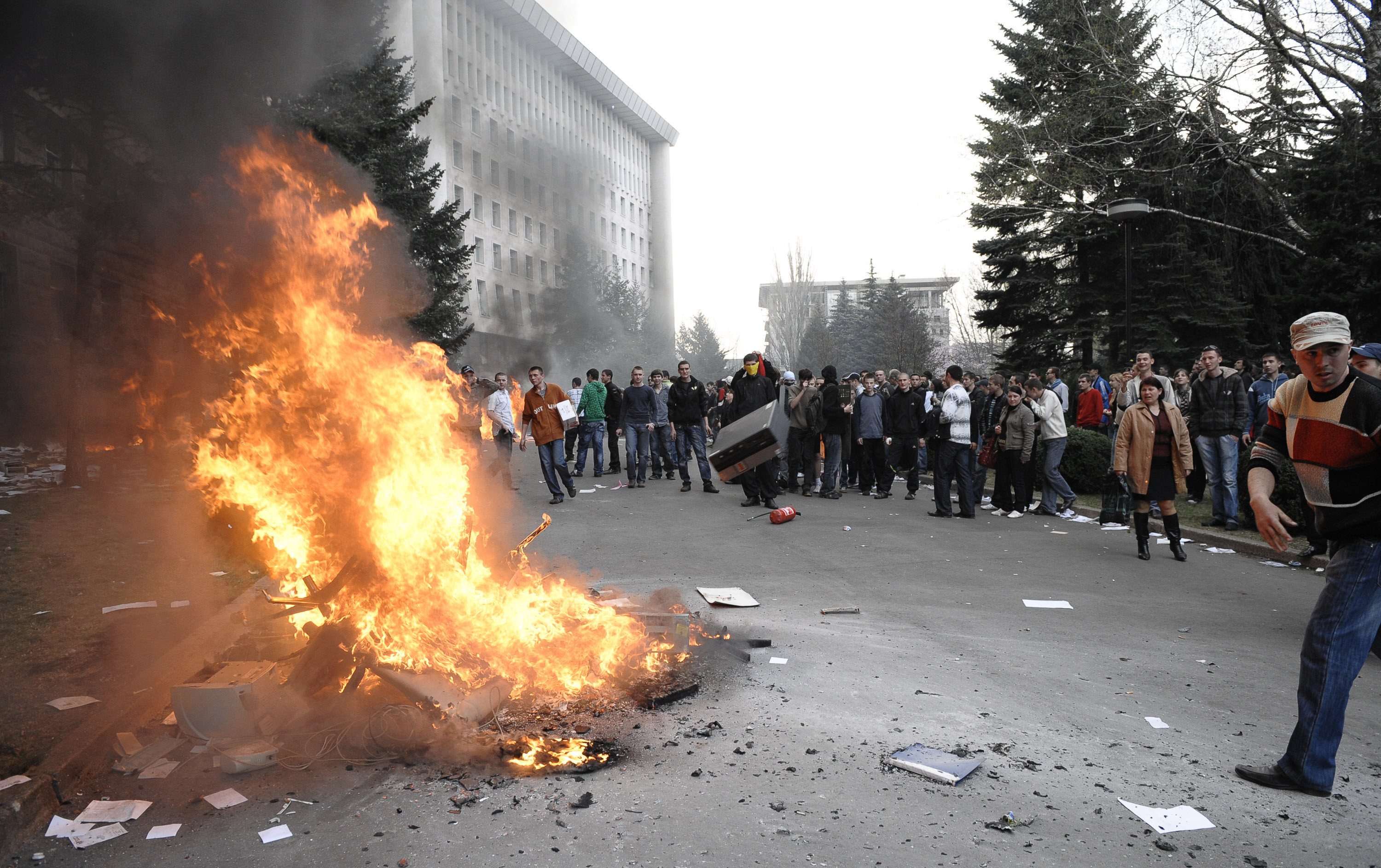 Dar, odata dezlantuiti, nimic nu le mai putea infrana elenul purificator. Au inceput apoi sa arunce direct de la ferestre calculatoare, iar in strada, piesele de mobilier si portretele lui Voronin au fost transformate in rug.