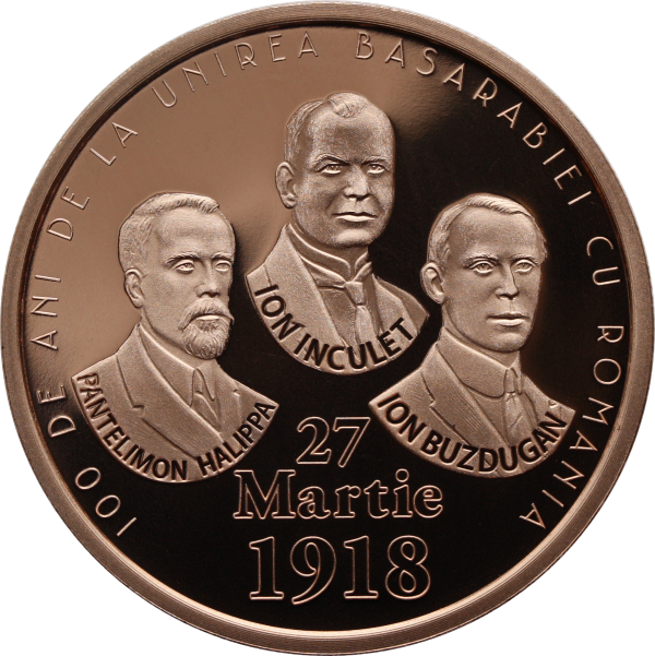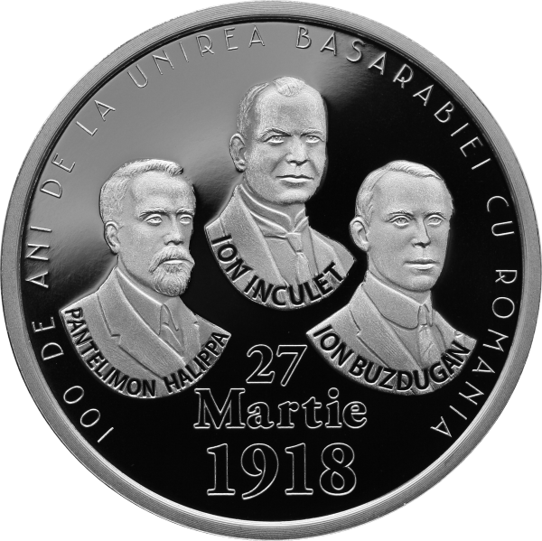 Reversul comun tuturor monedelor (din aur, argint, tombac cuprat şi din alamă) prezintă portretele şi numele celor trei semnatari ai Actului Unirii Basarabiei cu România: Ion Inculeţ, preşedinte al Sfatului Ţării, Pantelimon Halippa, vicepreşedinte şi Ion Buzdugan, secretar; inscripţiile, "100 DE ANI DE LA UNIREA BASARABIEI CU ROMÂNIA" şi 27 Martie 1918'.
