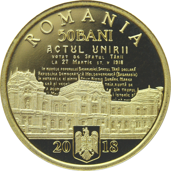 Aversul monedei din alamă, pentru colecţionare redă, în prim-plan, o imagine a clădirii Sfatului Ţării din Chişinău, în plan secund, un fragment din Actul Unirii Basarabiei cu România; inscripţia în arc de cerc "ROMÂNIA", valoarea nominală "50 BANI", stema României şi anul de emisiune "2018".