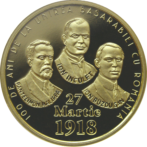 Aversul monedei din aur redă, în prim-plan, o imagine a clădirii Sfatului Ţării din Chişinău, unde, la data de 27 martie 1918, s-a votat unirea Basarabiei cu România, în plan secund, un fragment din Actul Unirii Basarabiei cu România; inscripţia în arc de cerc "ROMÂNIA", valoarea nominală "100 LEI", stema României şi anul de emisiune "2018".