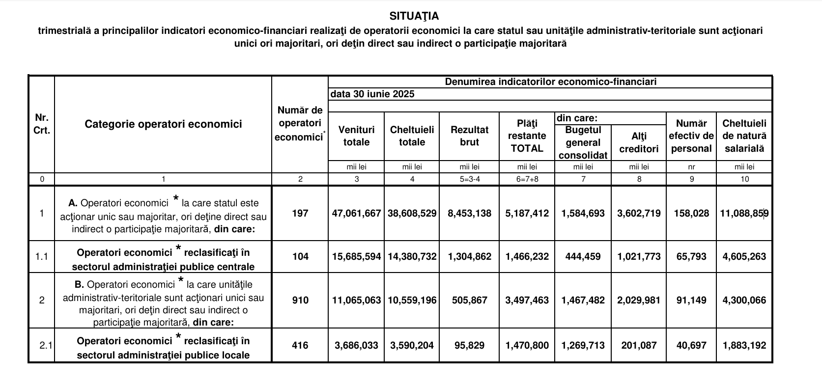 Pe de altă parte, toate aceste companii de stat au datorii cumulate de 8,6 miliarde lei, din care circa 3 miliarde lei sunt restanțe la bugetul de stat.