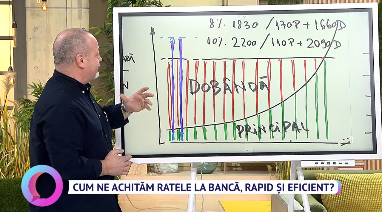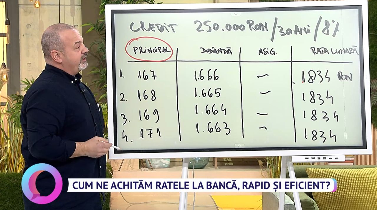 „Dintr-o rată de 1.834 lei, principalul este 167 de lei și dobânda 1.666 lei. În aceste perioade cu dobânzi mari este foarte eficient să plătești atincipat cu reducerea perioadei. În momentul în care ți-ai plătit rata lunară și mai faci rost de încă 170 de lei să zicem, sau o bucată de principal, și o achiți cu reducerea perioadei, în momentul în care tu ai mai achitat un astfel de principal, ai mai stins o lună și a dispărut dobânda. Cu 170 de lei tu poți să-ți stingi o rată care te-ar fi costat 1.800 de lei”, a precizat expertul.