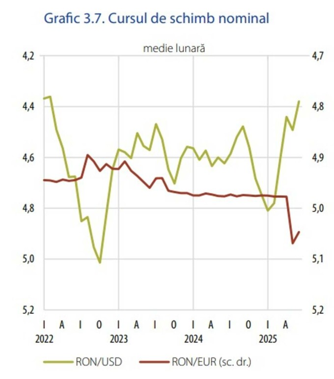 În iunie, detensionarea politică internă și progresele în formarea noii coaliții guvernamentale au favorizat o ușoară depreciere a leului, însă evoluțiile globale, precum intensificarea conflictului din Orientul Mijlociu, au determinat revenirea cursului aproape de nivelurile de la sfârșitul lunii mai, după cum se precizează în raportul băncii centrale.