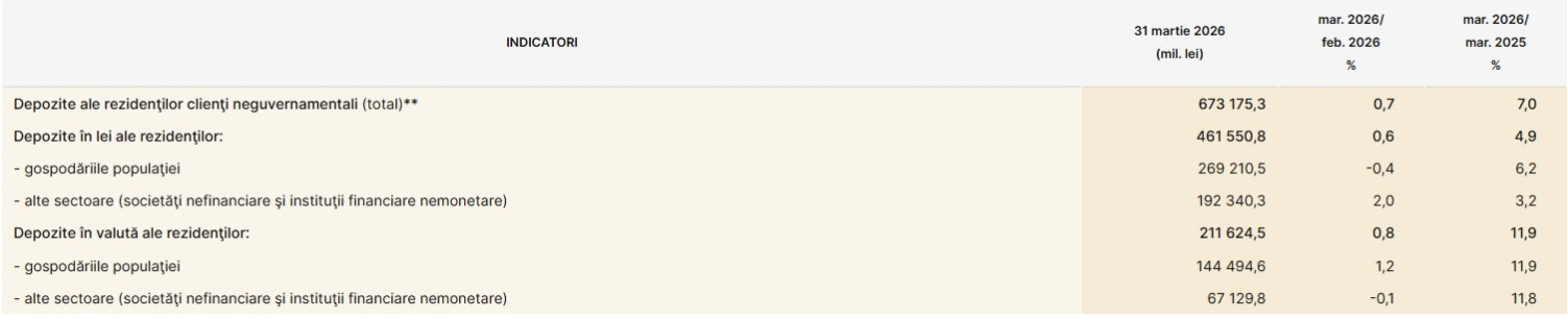 Depozitele în lei ale rezidenţilor, cu o pondere de 68,6% în totalul depozitelor clienţilor neguvernamentali, au crescut cu 0,6% faţă de luna februarie 2026, până la 461,551 miliarde lei. Comparativ cu luna martie 2025, acestea s-au majorat cu 4,9% (-4,5% în termeni reali).