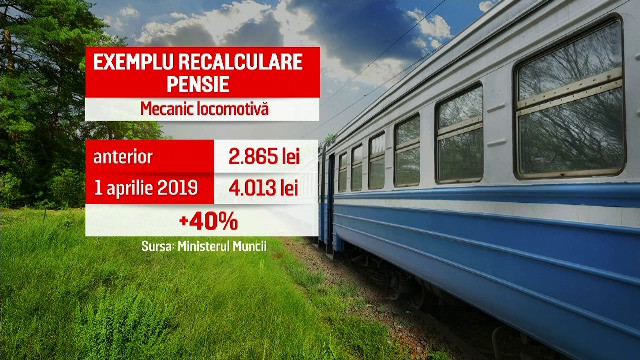 De exemplu, potrivit Ministerului Muncii, un pensionar care a lucrat ca mecanic de locomotivă va ajunge să încaseze, lunar, 4.000 de lei. Iar un fost miner de la Deva va avea o pensie de aproape 3.150 de lei după recalculare, adică o creştere de 42%.