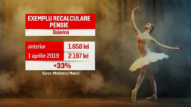 De o majorare similară va beneficia şi un fost lucrător în zona 1 de radiaţii, care va primi puţin peste 2.800 de lei. Creşteri sunt şi pentru cei care au fost acrobaţi la circ ori balerini. De pildă, o fostă balerină ar putea ajunge să încaseze 2.200 de lei.