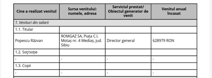 Potrivit ultimei declarații de avere, depusă de directorul general Răzvan Popescu în iunie 2024, veniturile totale încasate în anul anterior de la Romgaz s-au ridicat la suma netă de 628.979 lei.