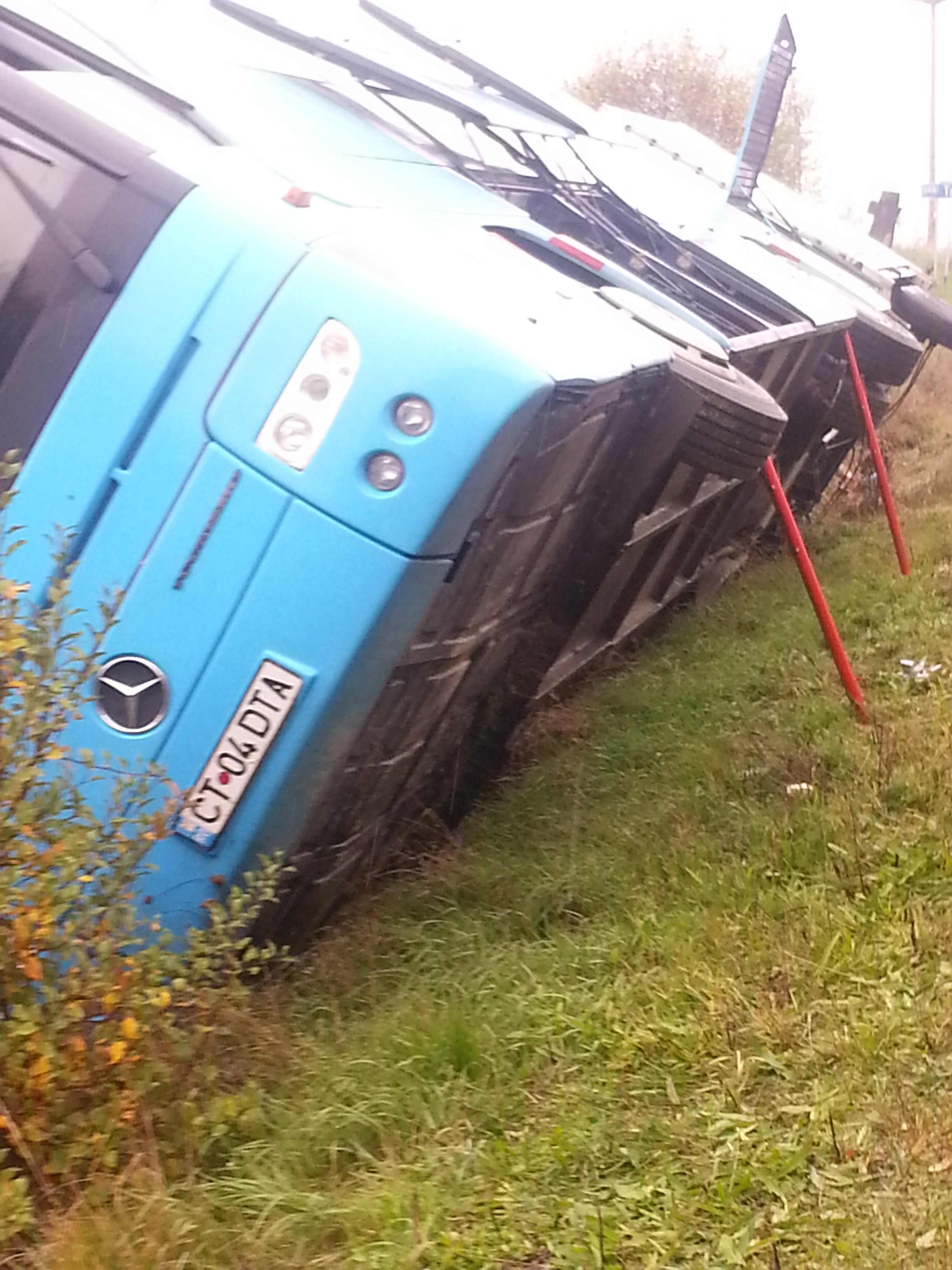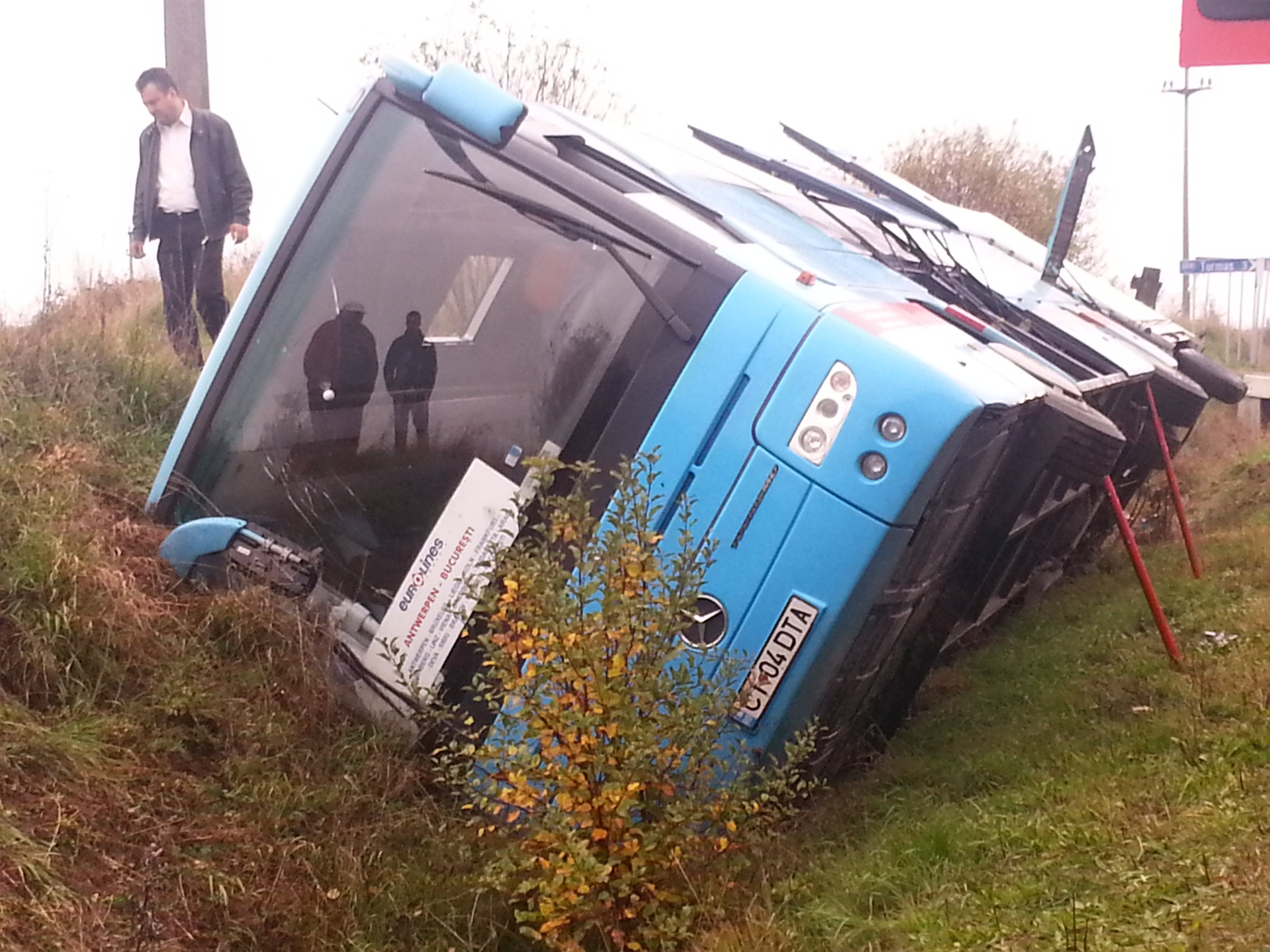 Un autocar in care se aflau 23 de persoane si care circula pe ruta Constanta – Belgia, s-a rasturnat in sant, doua persoane fiind ranite usor in urma acestui incident.