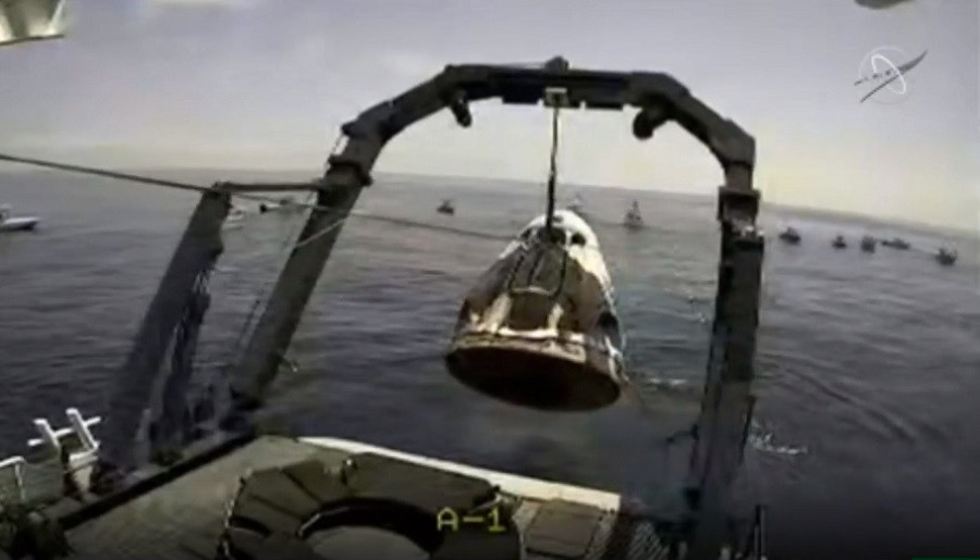 Echipajul urma să petreacă o oră în capsula plutitoare, înainte de a fi recuperaţi de echipele SpaceX şi NASA şi a fi transportaţi la ţărm cu un elicopter. Astronauţii vor fi supuşi unor controale medicale înainte de a zbura la Johnson Space Center al NASA din Houston, Texas.