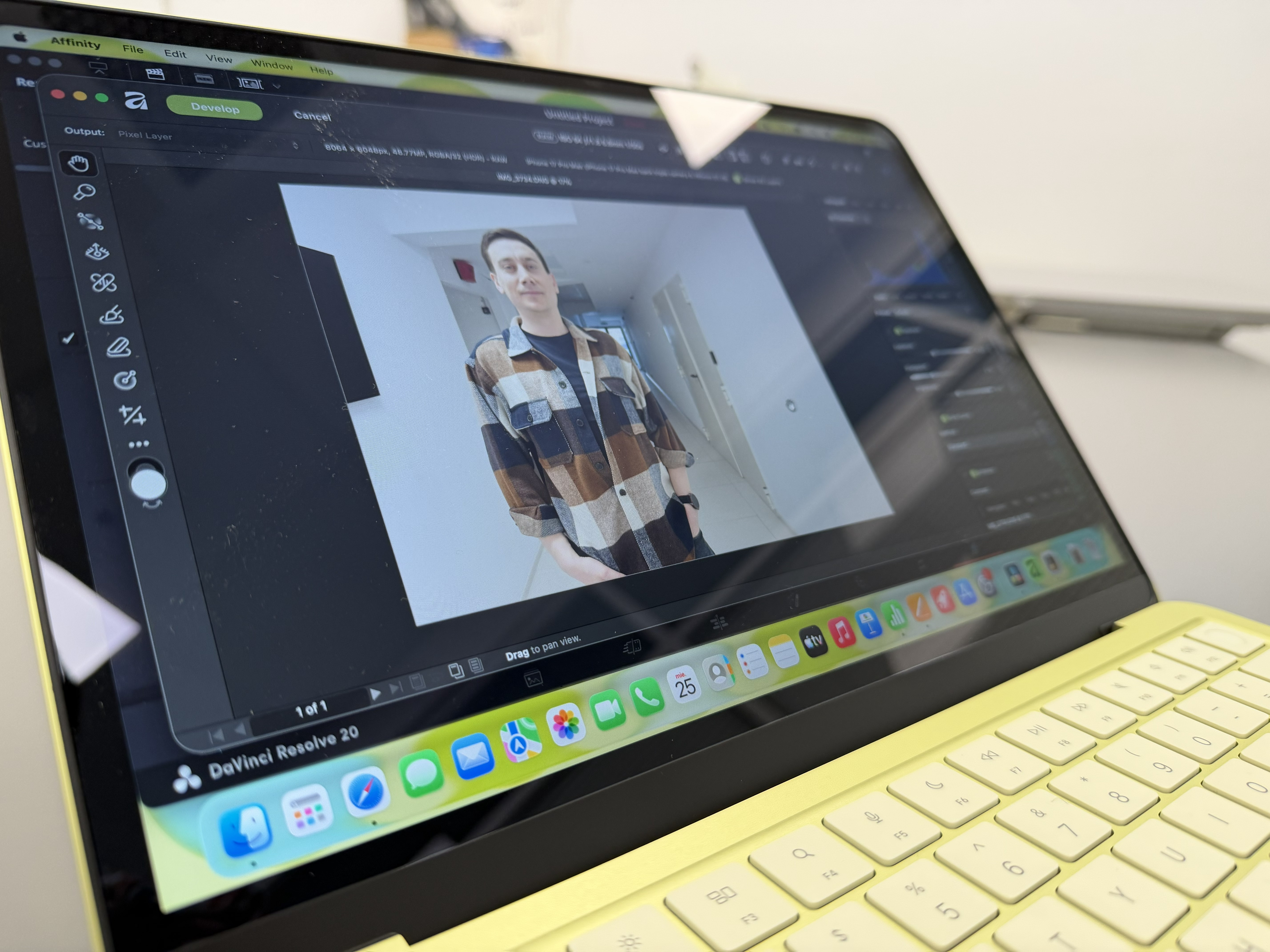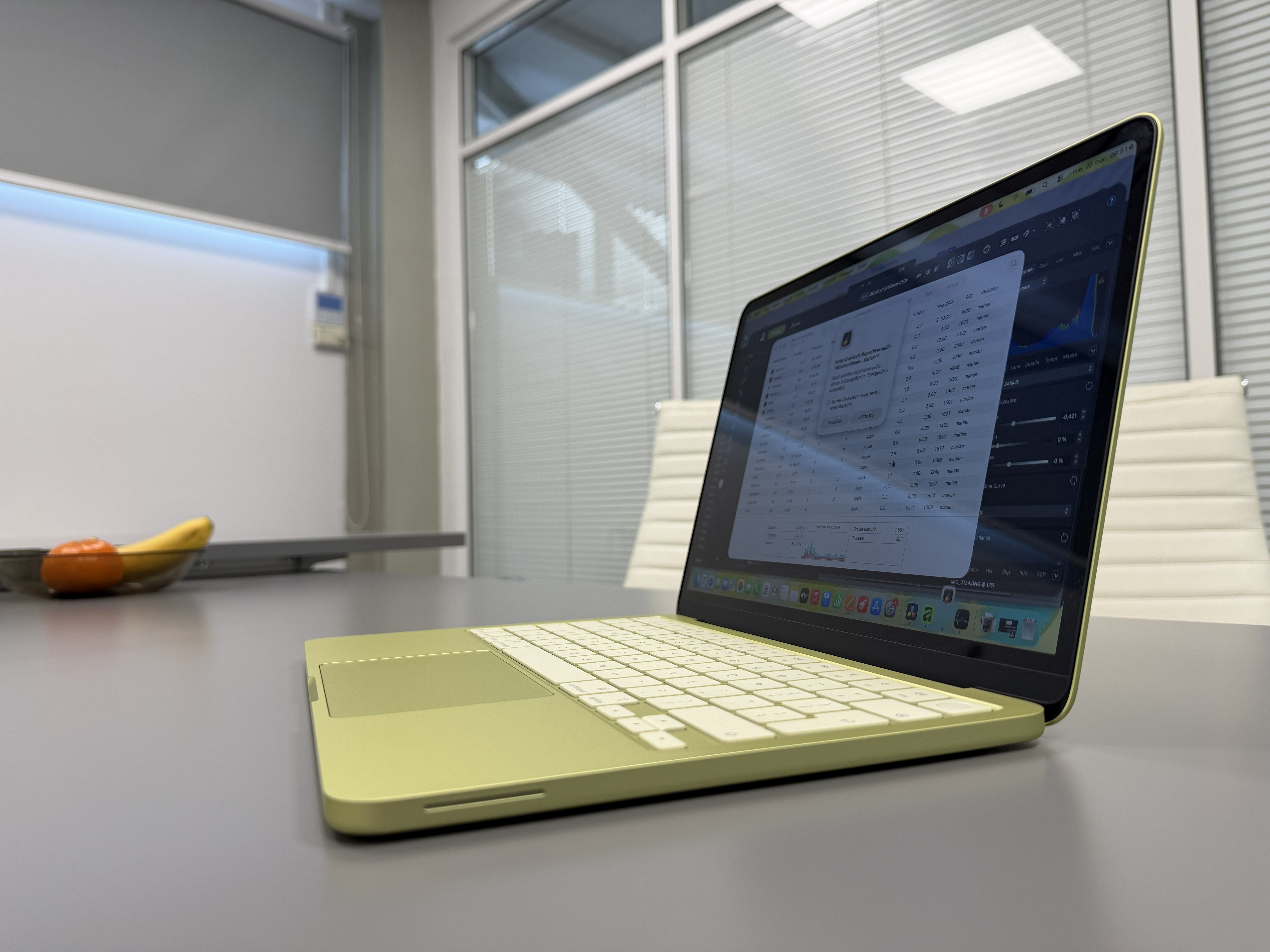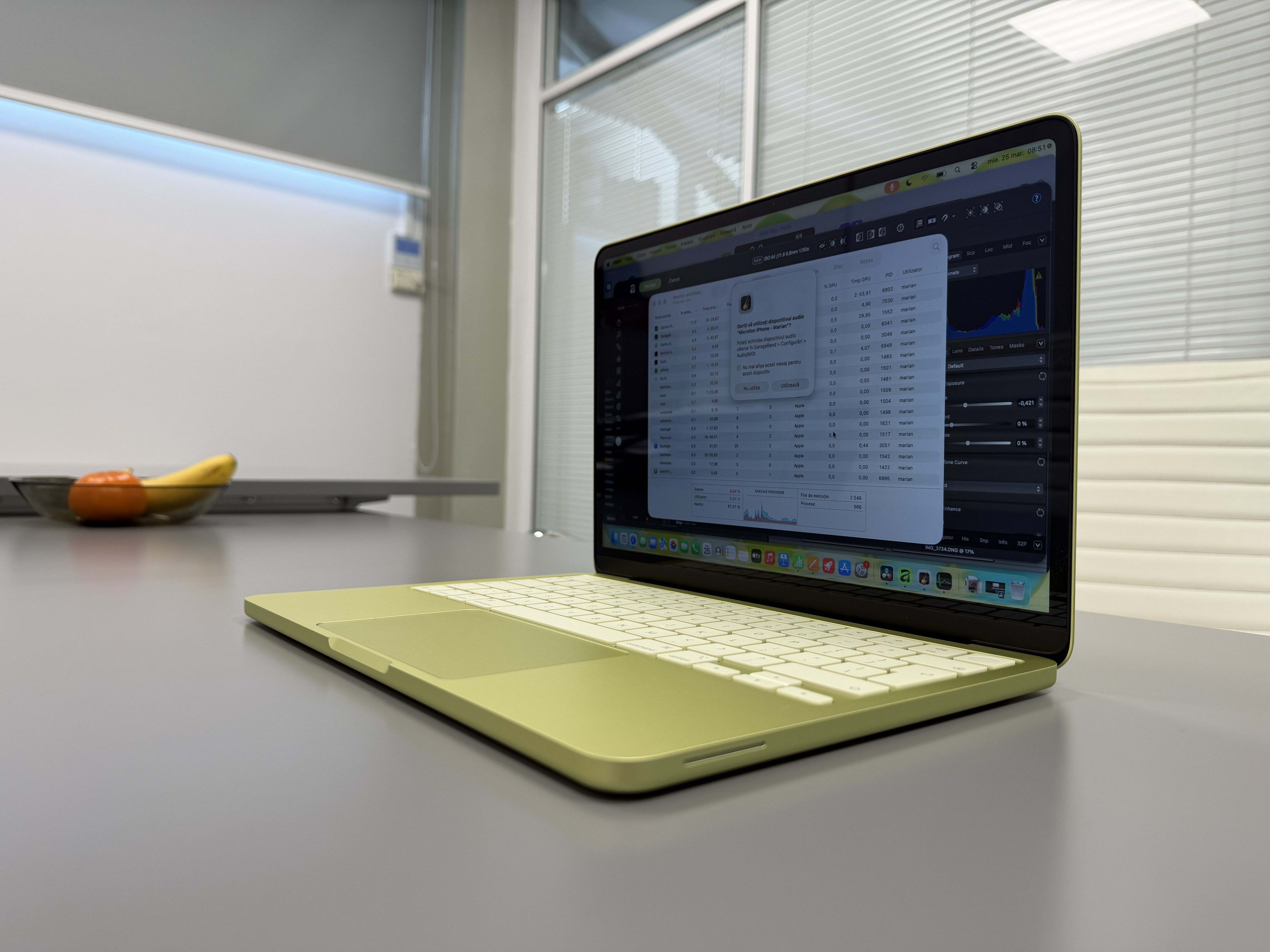 Am folosit pe el și DaVinci Resolve, varianta gratuită, și am pus în timeline doar video 4K 60fps, trimis prin AirDrop de pe un iPhone 17 Pro. S-a descurcat și la editare, fără lag în timp real și la export. Nu s-a încins. Am editat și cu Affinity mai multe poze în batch, RAW, dar am făcut muzică și cu GarageBand cu mai multe layere de sunete care rulau simultan. Iarăși, nu am simțit că e stânjenit de ceva.