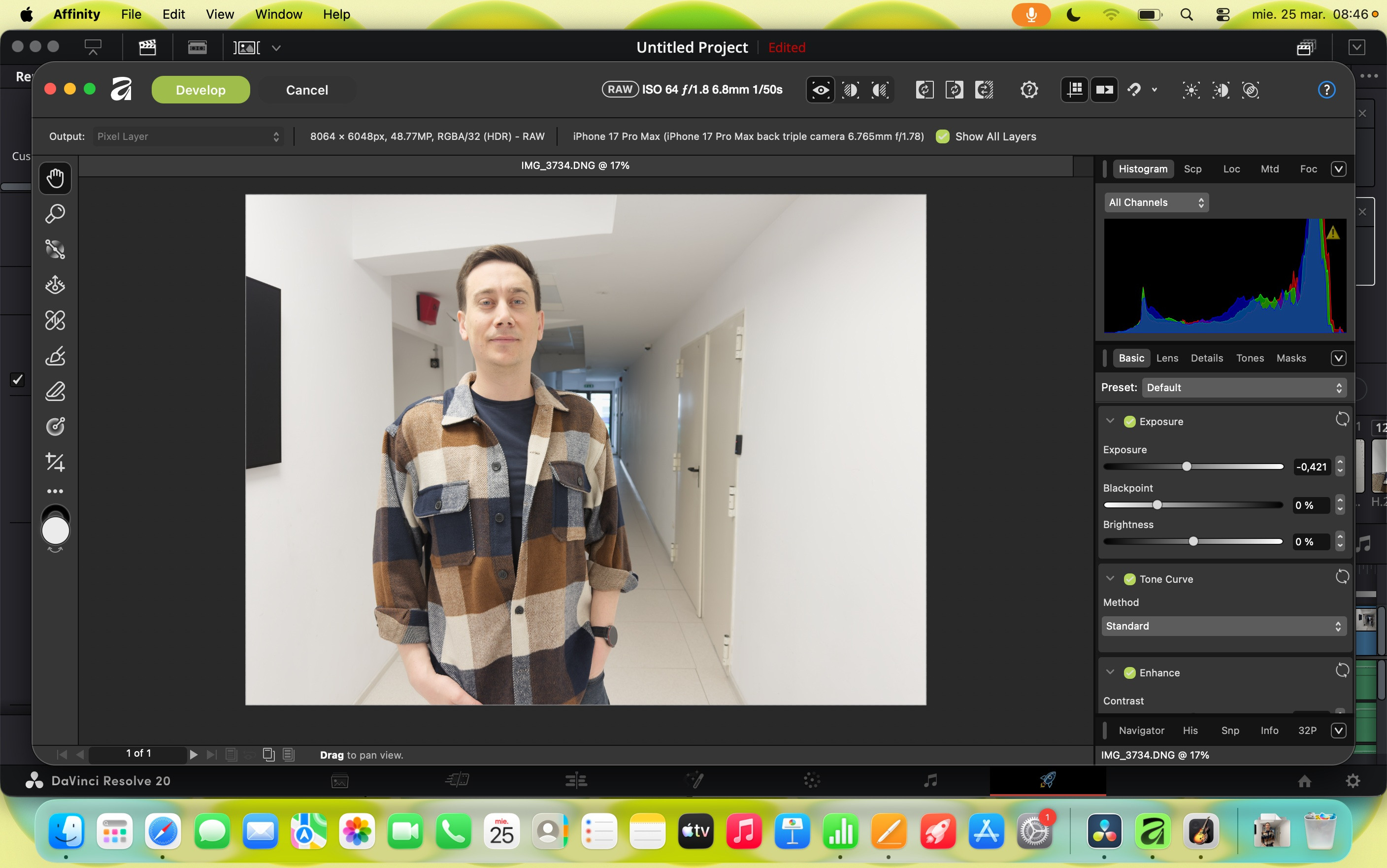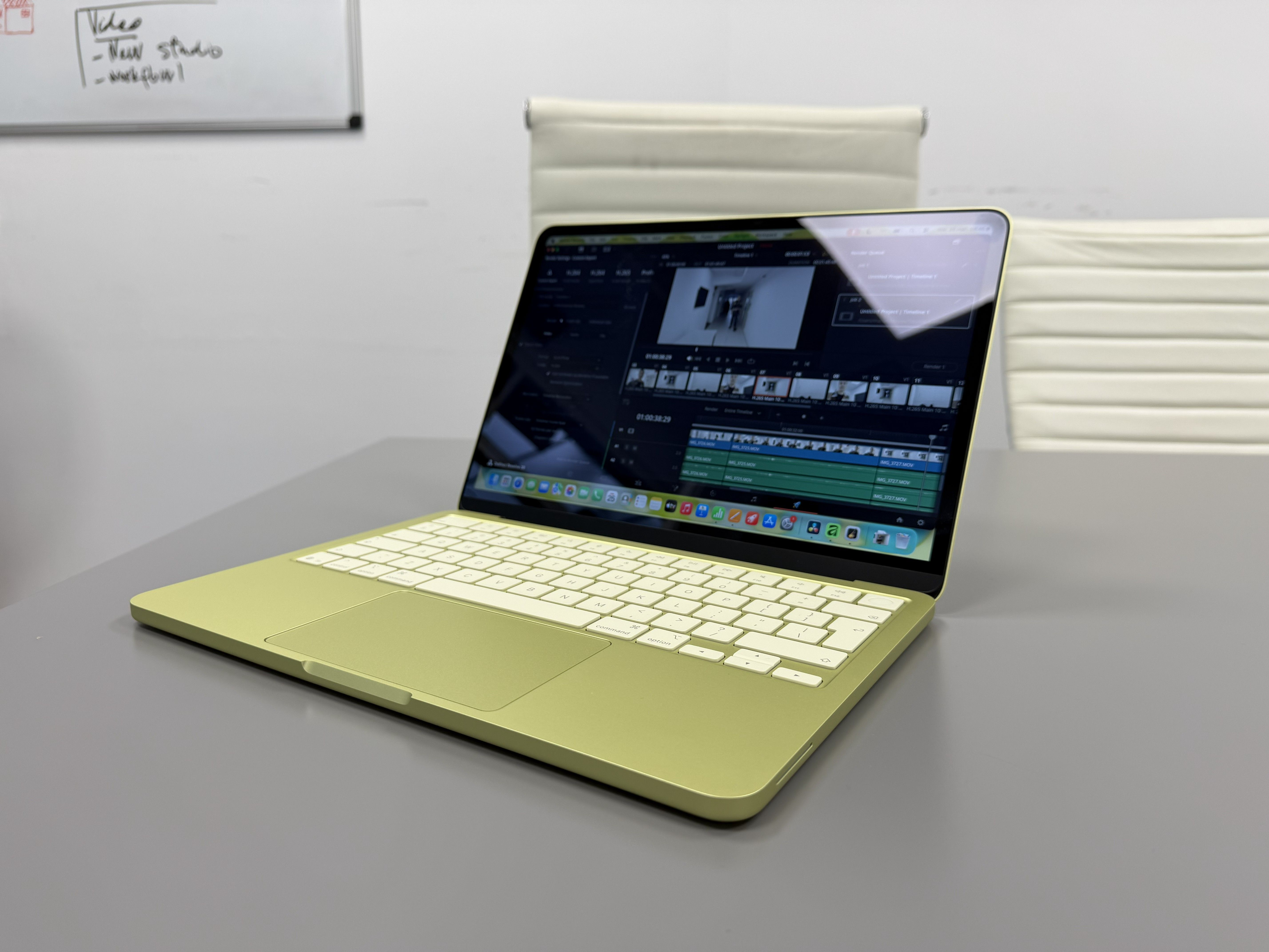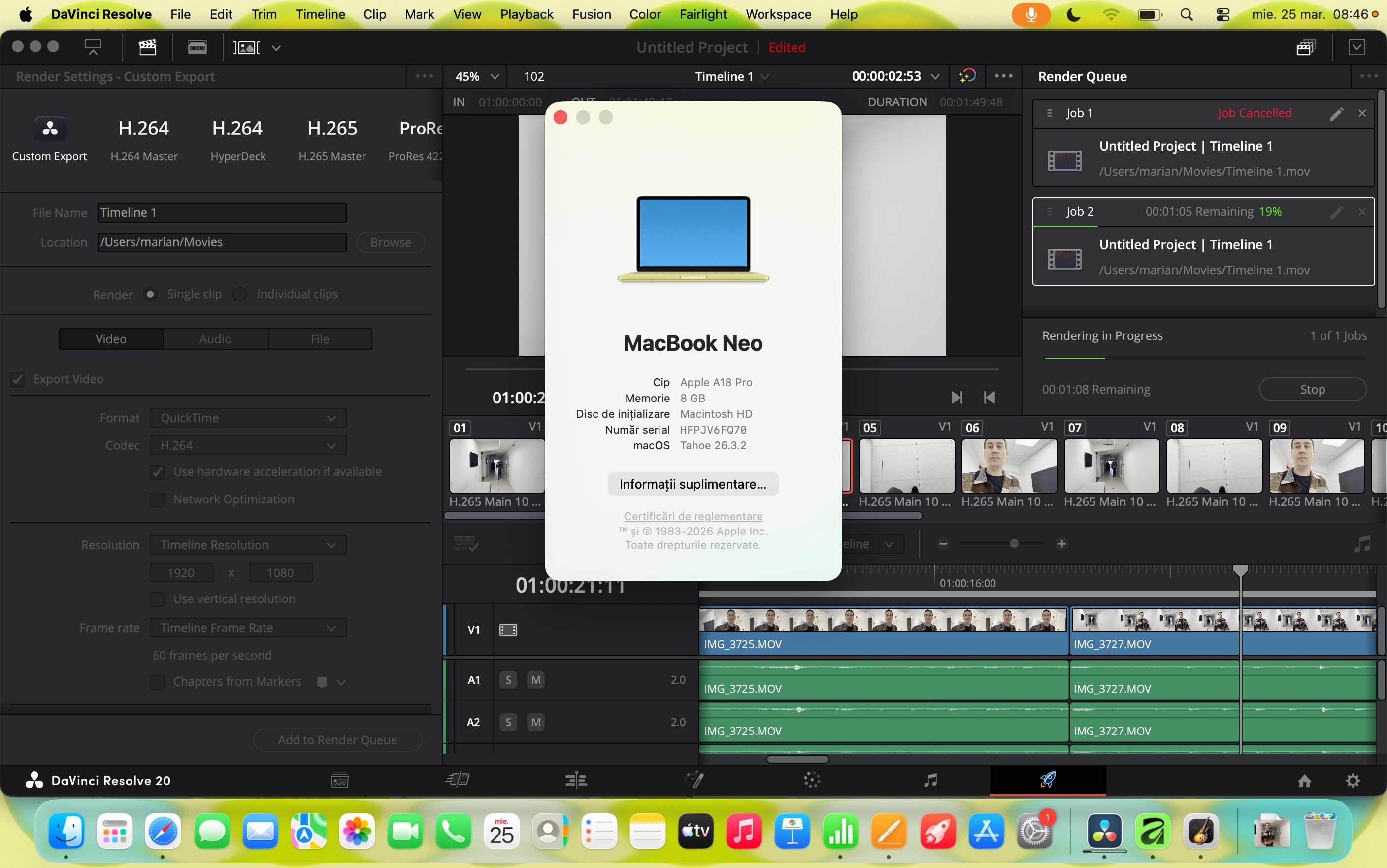 Am folosit pe el și DaVinci Resolve, varianta gratuită, și am pus în timeline doar video 4K 60fps, trimis prin AirDrop de pe un iPhone 17 Pro. S-a descurcat și la editare, fără lag în timp real și la export. Nu s-a încins. Am editat și cu Affinity mai multe poze în batch, RAW, dar am făcut muzică și cu GarageBand cu mai multe layere de sunete care rulau simultan. Iarăși, nu am simțit că e stânjenit de ceva.