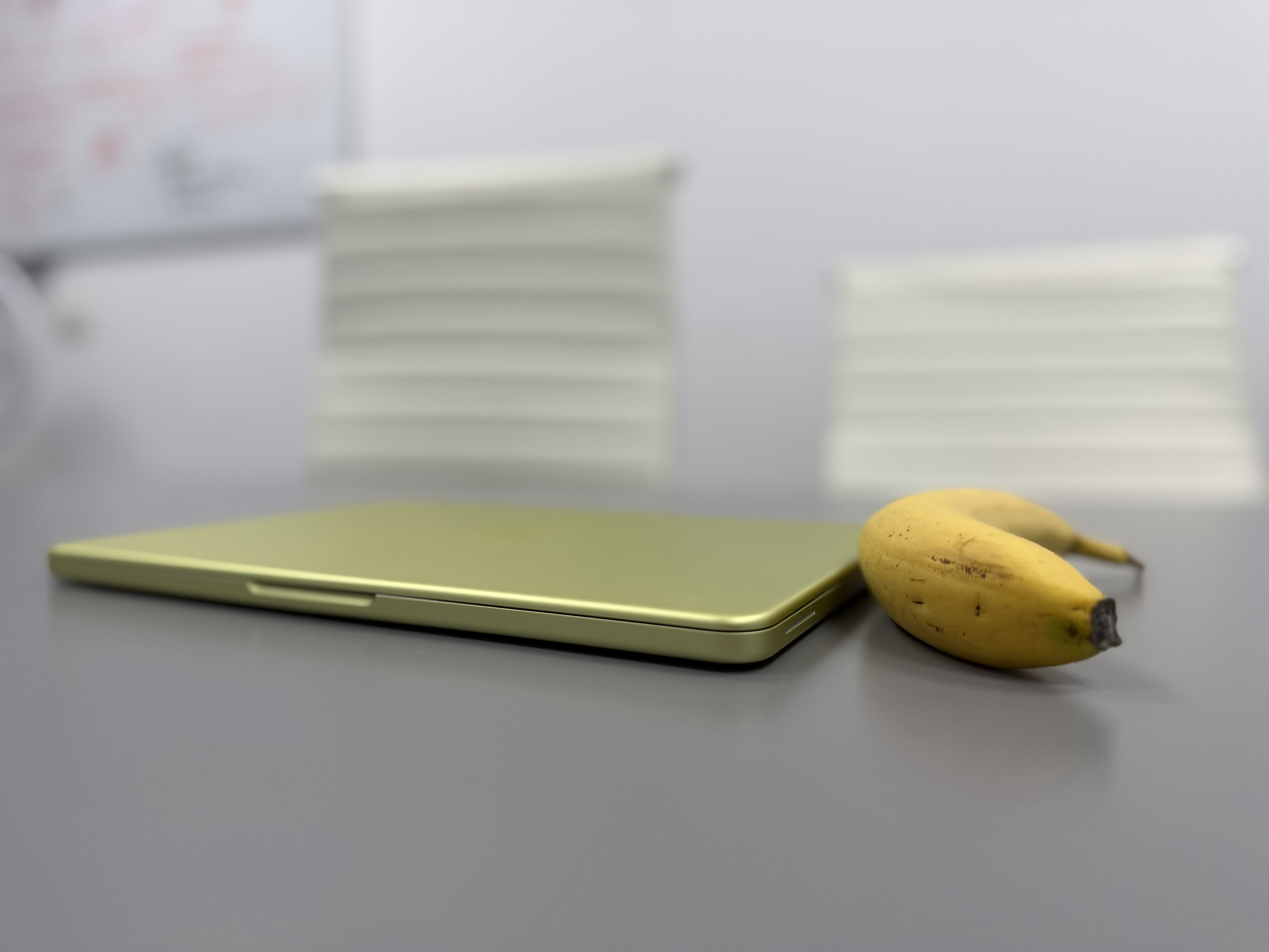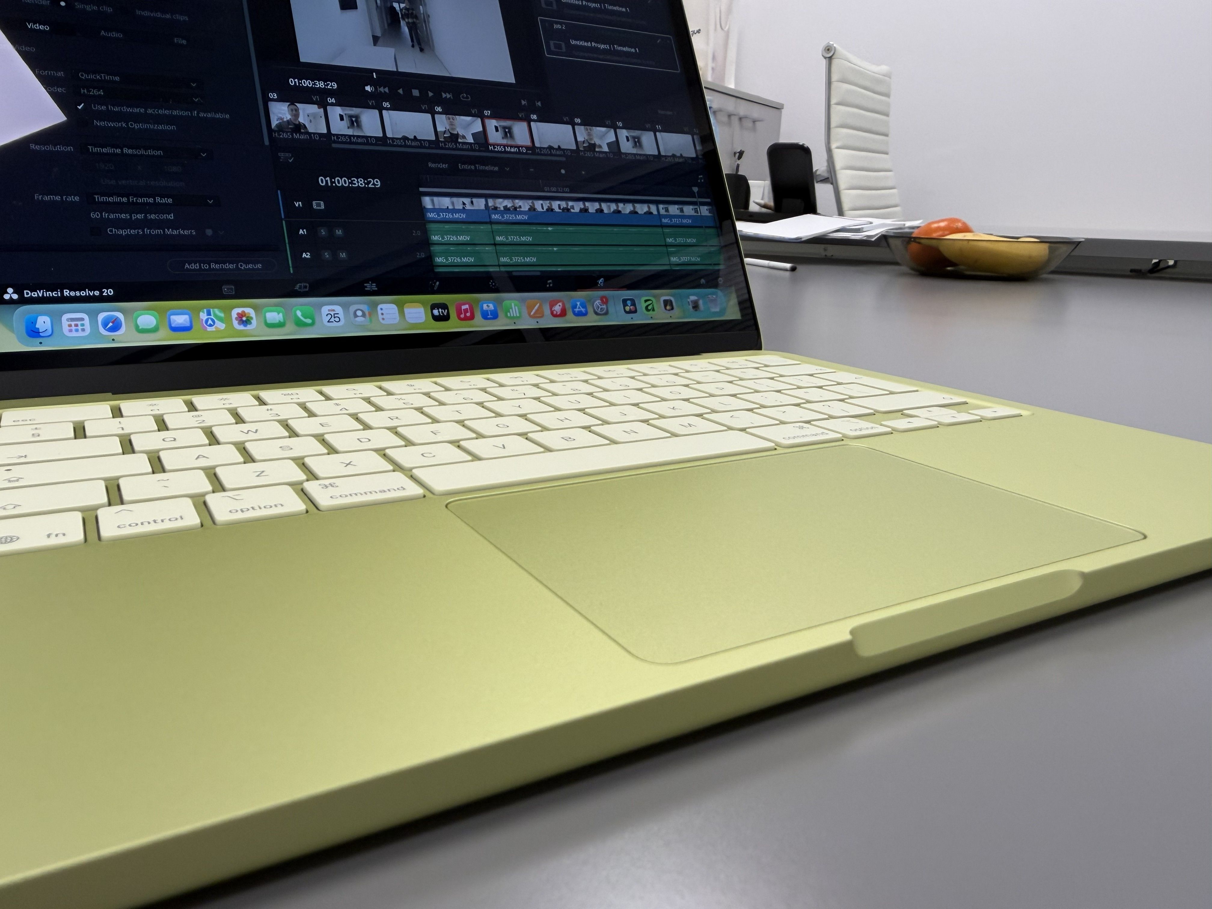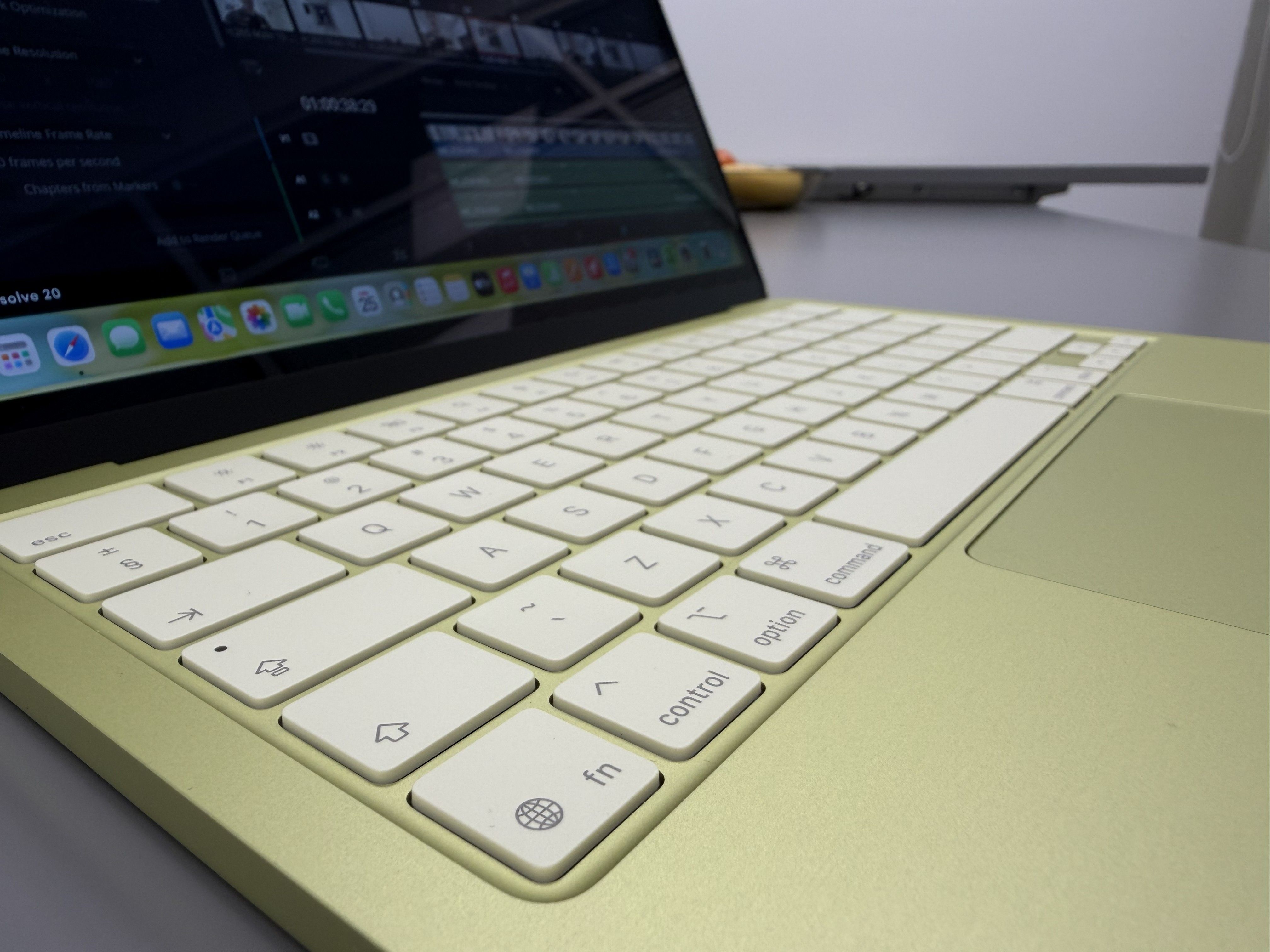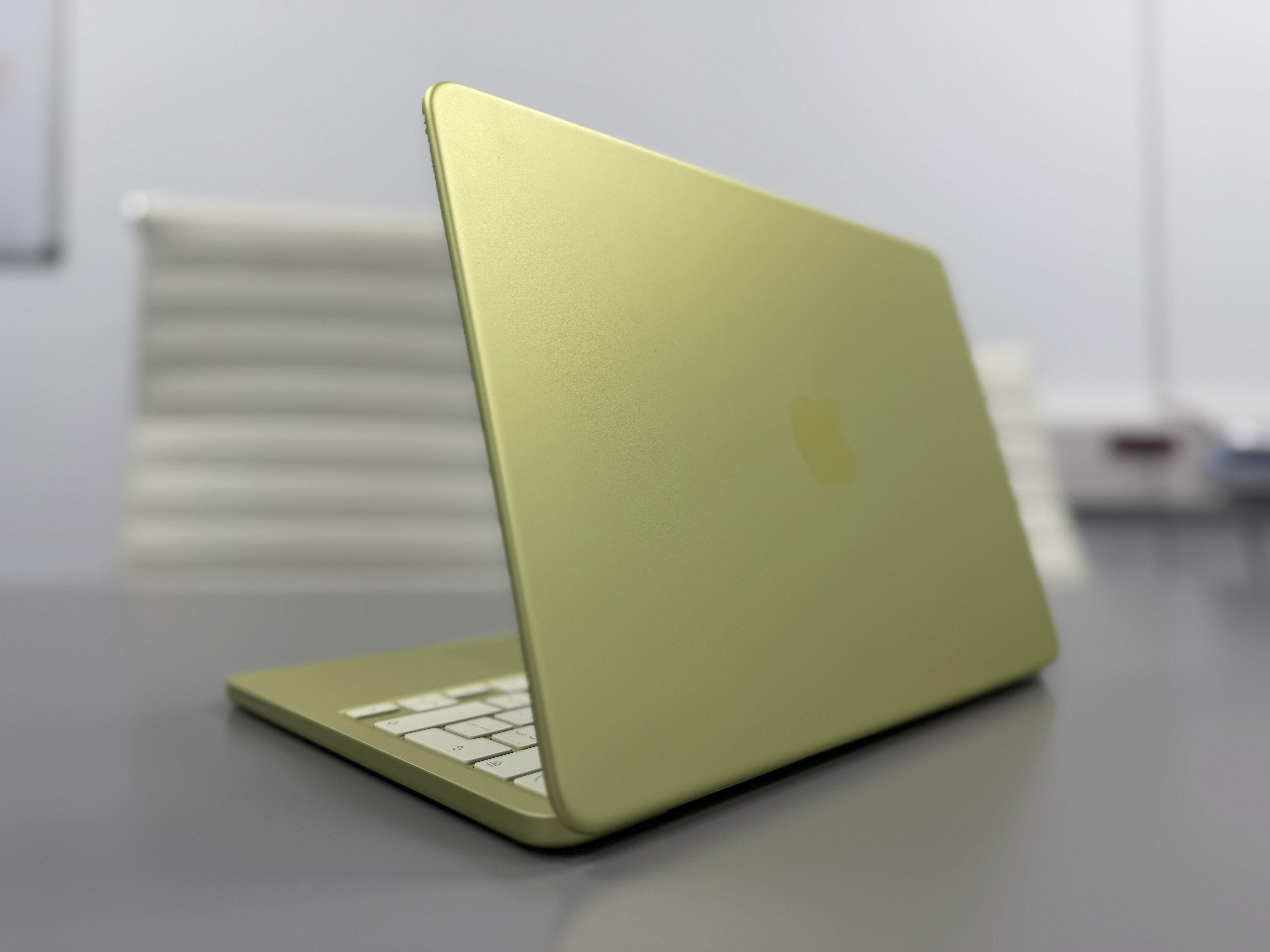 Produsul vine în aceeași cutie ca oricare alt MacBook, ambalat identic. Și m-a lovit culoarea: Citrus Green, verdele unui citric tânăr, prins exact în momentul în care nu s-a hotărât încă dacă e galben sau verde. Și apoi pui mâna pe el și se simte greu, la 1,23 kg. Adică mai greu decât te aștepți, pentru că este destul de dens la 13 inch diagonală. Deși cântărește cât un Air, se simte altfel.