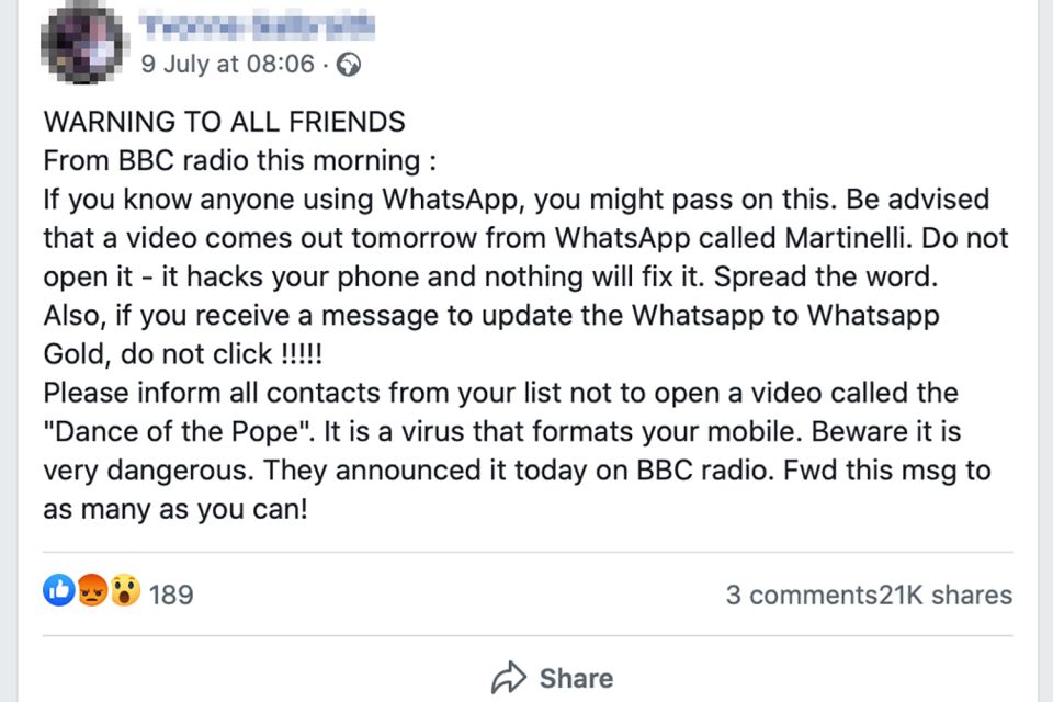 „Dacă cunoști pe cineva care folosește WhatsApp ai putea să îi trimiți asta. Un coleg de la IT avertiează că mâine va apărea un video de la WhatsApp, numit Martinelli. Nu îl deschide pentru că îți infectează telefonul și nimic nu îl va mai repara. Trimite mai departe. Dacă primești un mesaj ca să actualizezi WhatsApp și să treci la WhatsApp Gold, nu da click! Vă rog să informați toate persoanele din lista de contacte să nu deschidă un video numit „Dansul Papei” / „Dance of the Pope”. Este un virus care formatează telefoanele. Aveți grijă, este foarte perculos. Au anunțat astăzi la radio BBC. Trimiteți acest mesaj la cât mai multe persoane!”, este mesajul primit de mai multe persoane.