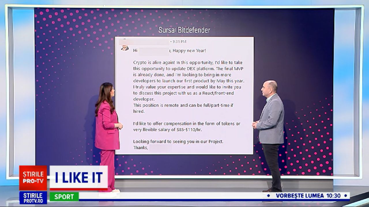 ”I-au spus că au o pozișie deschisă, pe o platformă de crypto- bineînțeles că este foarte fierbinte subiectul ăsta, toată lumea crede că se poate îmbogăți de la chestia asta – și că au nevoie doar de niște developeri pentru a merge mai departe cu proiectul”, a mai spus Stahie.