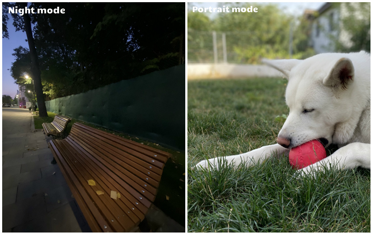 Un mare progres este reprezentat de modul noapte, în comparație cu modelele de anul trecut. Nu există un mod dedicat ca pe alte telefoane, însă devine activ când senzorii detectează condiții slabe de lumină. Utilizatorul poate să dezactiveze funcția, să aleagă varianta automată sau să o selecteze pe cea maximă pentru o expunere mai lungă. Aceasta poate varia, însă poate ajunge până la 28 de secunde dacă telefonul se află pe trepied. Din păcate, modul noapte nu este disponibil pe camera ultrawide și nici pe cea pentru selfie. Modul portret poate acum să fie folosit nu doar în cazul în care subiectul fotografiat este un om, putând astfel să existe efectul bokeh în diferite situații. Iar efectul este încântător, camera reușind să separe subiectul de planul îndepărtat într-un mod plăcut.