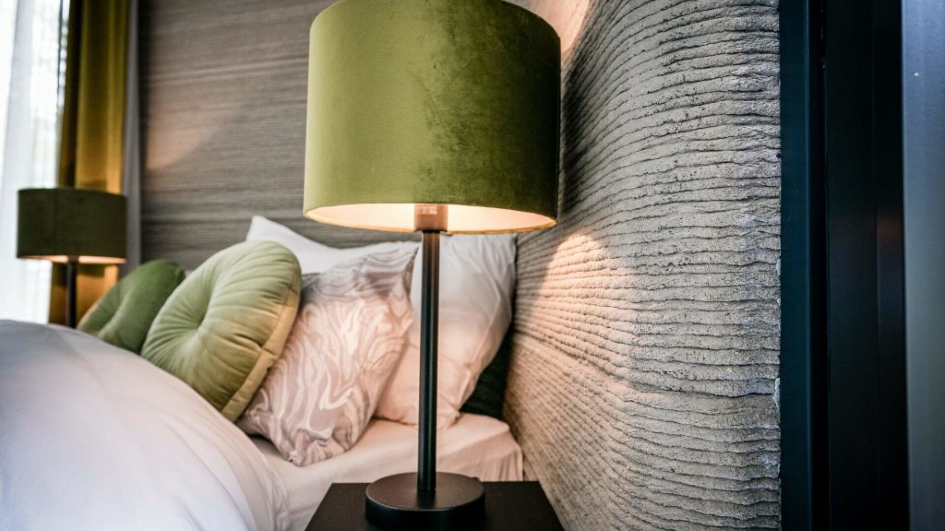 Pereţii sunt în totalitate realizaţi din elemente de ciment, care au fost printate la o imprimantă 3D industrială, centimetru cu centimetru, până când fiecare placă ajunge la o înălţime de 3 metri.