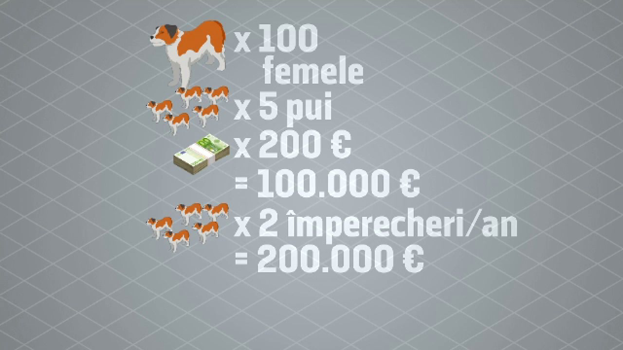 La aproximativ 100 de cățelușe, câte am estimat în curtea sa, câştigul poate fi considerabil. Dacă fiecare naşte câte 5 pui, aceştia - vânduţi ulterior cu minimum 200 de euro bucata - ar aduce un profit de 100.000 de euro. Iar suma finală ar putea fi dublă, pentru că femelele sunt împerecheate de două ori pe an - fapt complet interzis de asociaţiile chinologice din întreaga lume.