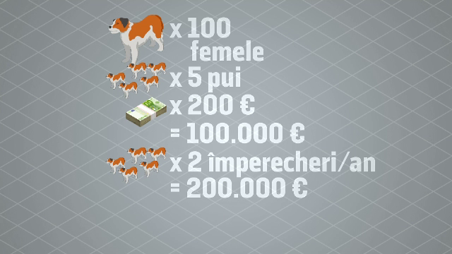 La aproximativ 100 de cățelușe, câte am estimat în curtea sa, câştigul poate fi considerabil. Dacă fiecare naşte câte 5 pui, aceştia - vânduţi ulterior cu minimum 200 de euro bucata - ar aduce un profit de 100.000 de euro. Iar suma finală ar putea fi dublă, pentru că femelele sunt împerecheate de două ori pe an - fapt complet interzis de asociaţiile chinologice din întreaga lume.