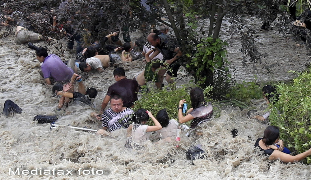 Sute de chinezi au fost surprinsi, vineri, de valuri uriase, cu o inaltime de aproape 20 de metri, in timp ce priveau spectacolul de pe raul Qiantang.