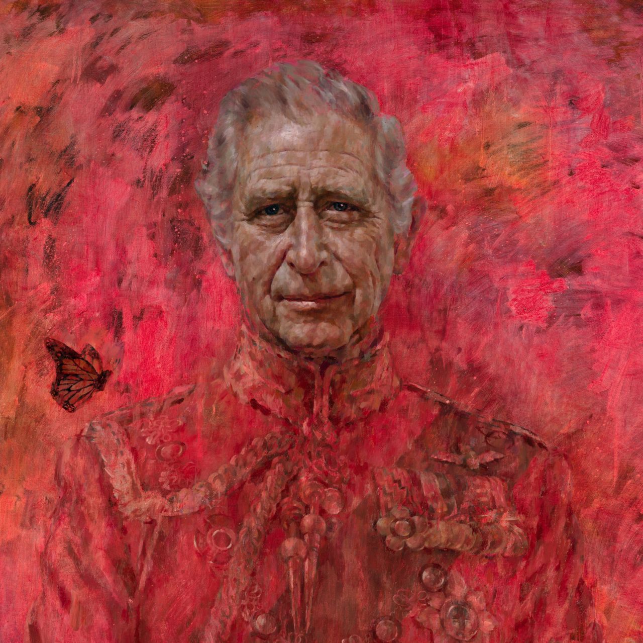 Portretul, realizat de artistul Jonathan Yeo, îl înfăţişează pe regele britanic pe un fundal în nuanţe de roşu aprins, purtând uniforma militară a Gardei Galeze. Deasupra unuia din umerii suveranului, este pictat un fluture.