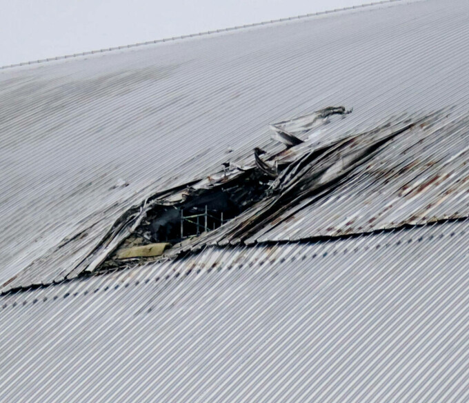 FOTO: La 12 aprilie 2025, la Cernobîl, Ucraina, un acoperiș al noului adăpost de siguranță care acoperă reactorul numărul 4 de la centrala nucleară a fost deteriorat de un atac cu dronă rusesc. La 14 februarie 2025, un atac al unei drone rusești a deteriorat semnificativ noul adăpost de siguranță, care acoperă sarcofagul și reactorul numărul 4 de la centrala nucleară Cernobîl, care a fost distrus în timpul catastrofei din 1986.
