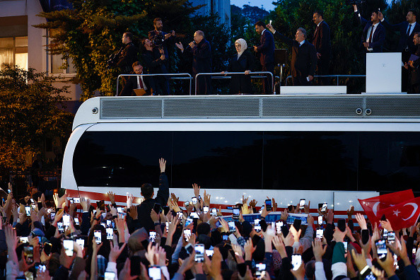 Chiar înainte că numărătoarea voturilor să se fi încheiat, Recep Taip Erdogan şi-a anunțat victoria în alegeri. A ieșit în fața reședinței sale din Istanbul, de unde a salutat mulțimea de susținători, cocoțat pe autobuzul de campanie.