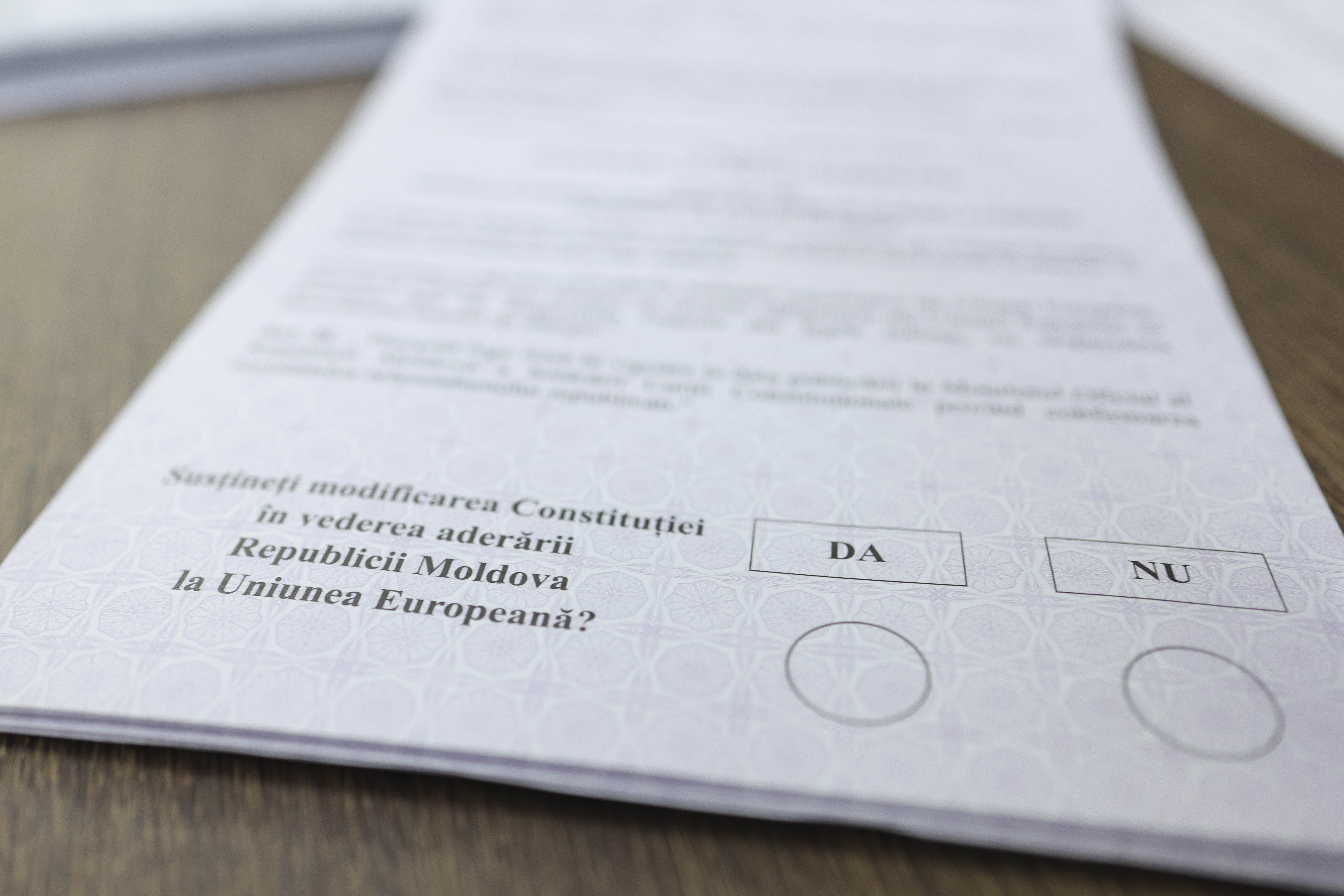 UPDATE DUMINICĂ, ORA 07:43 - Participanții la alegeri vor primi câte două buletine de vot – unul pentru a pune ștampila „Votat” în dreptul candidatului pe care-l vor șef al statului, iar altul – pentru a bifa opțiunile „DA” sau „NU” răspunzând la întrebarea „Susțineți modificarea Constituției în vederea aderării Republicii Moldova la Uniunea Europeană?”.