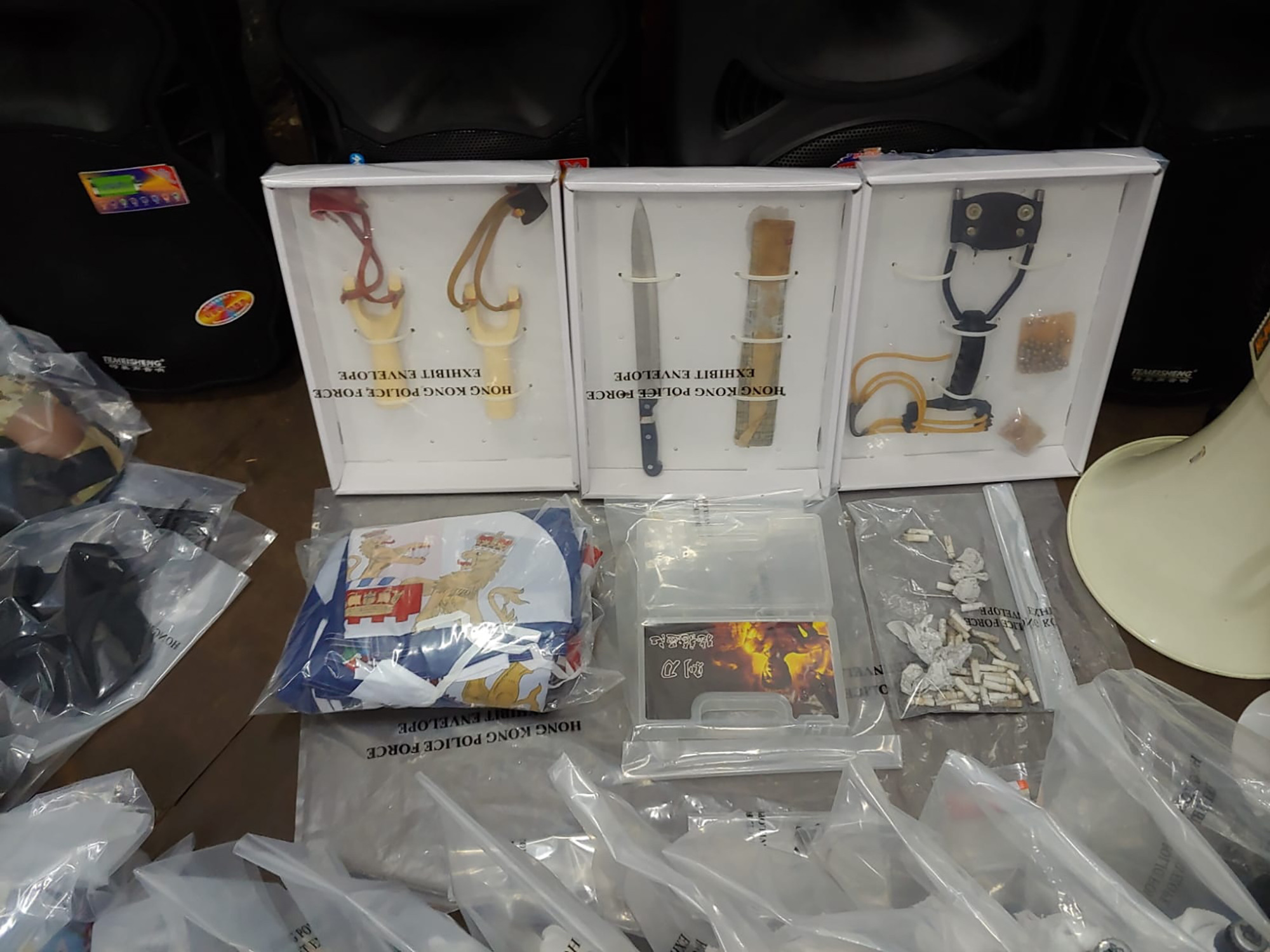 Poliţia a declarat că a confiscat în timpul operaţiunii un tricou cu logo-ul "Frontului Naţional din Hong Kong", un grup pro-independenţă, precum şi pliante având legătură cu manifestaţiile antiguvernamentale care agită teritoriul semi-autonom.
