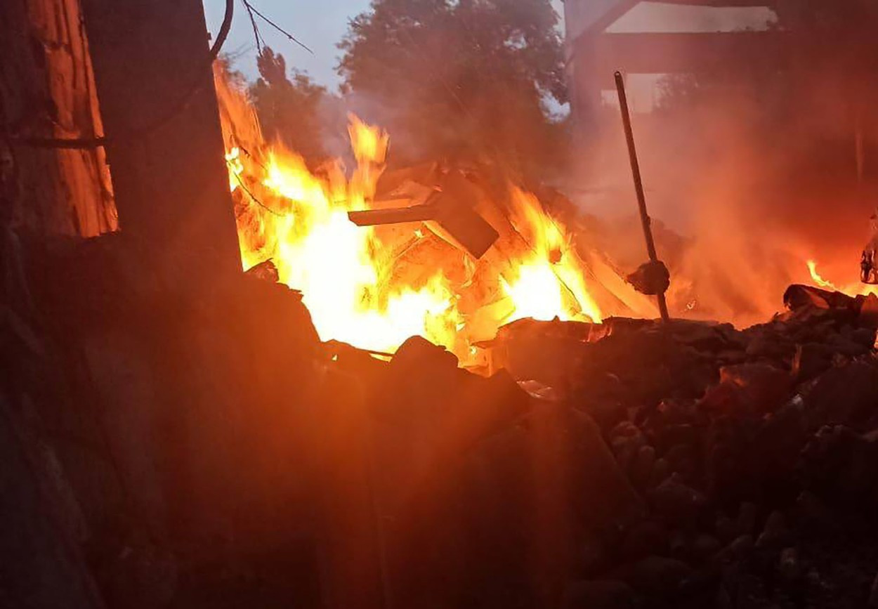 Blocul de locuinţe cu cinci etaje, situat în centrul oraşului, a luat foc după ce a fost lovit în atacul din cursul nopţii. Dimineaţă, încă ieşea fum din clădire, iar în faţa blocului locatarii plângeau.