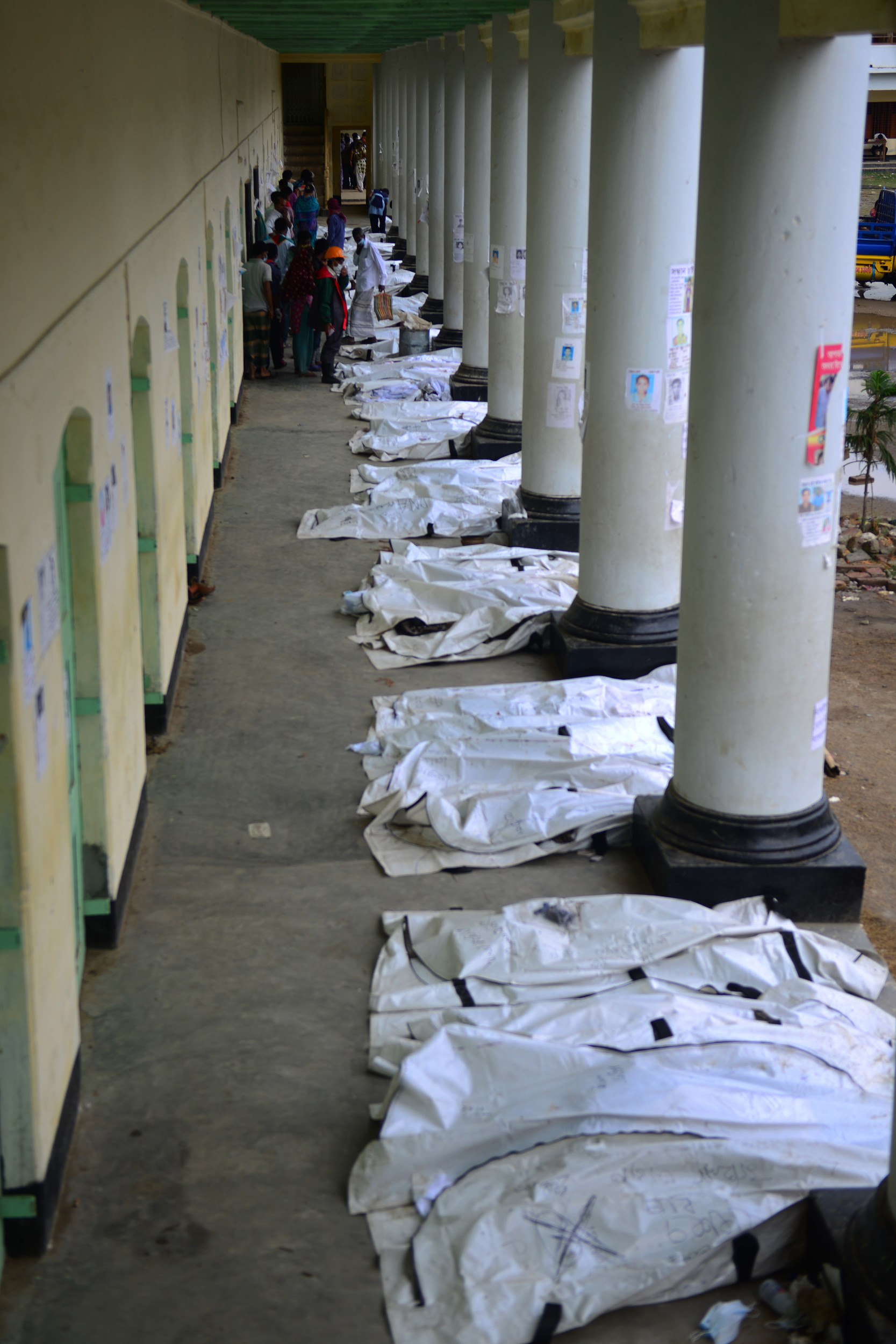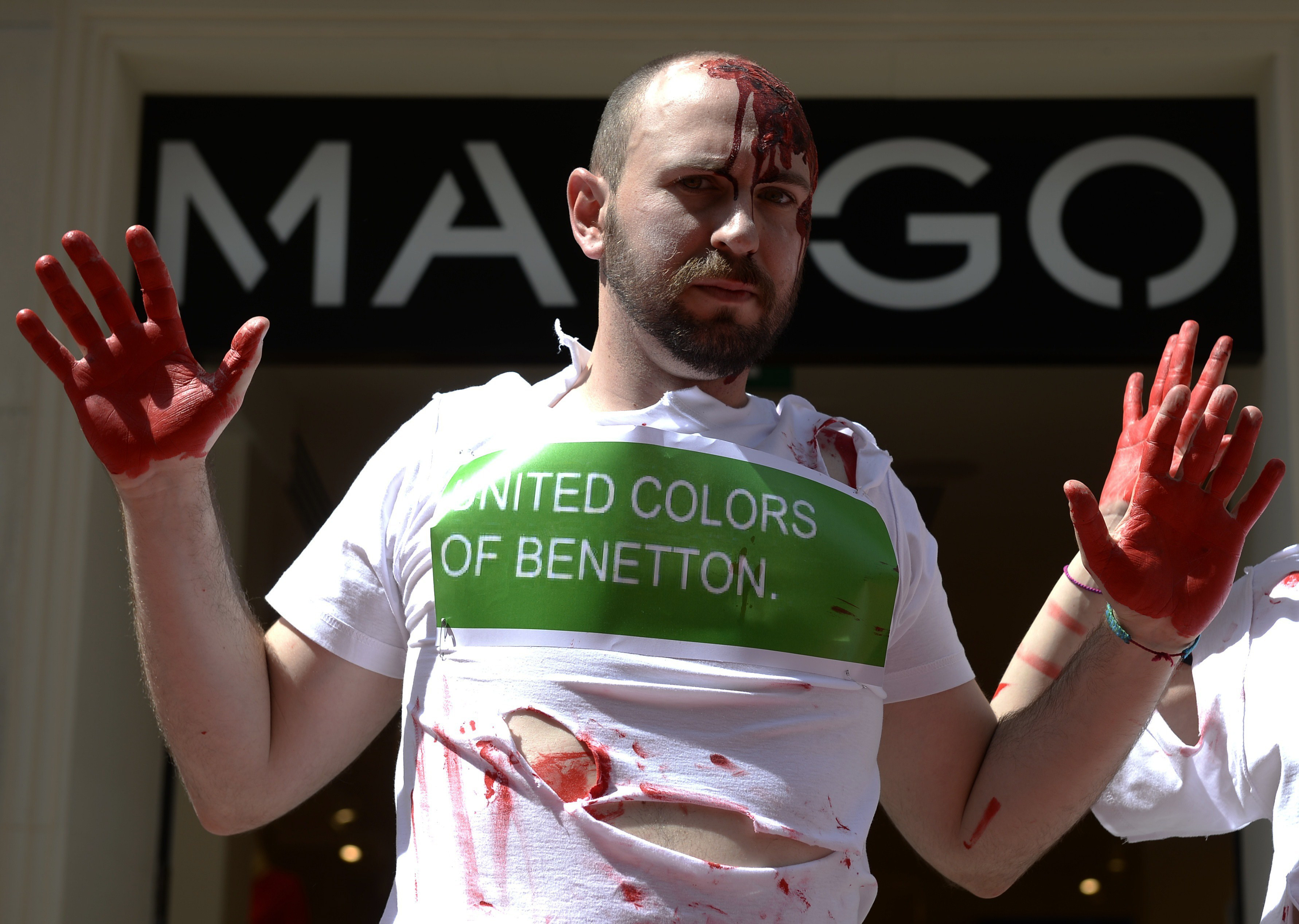 Denuntand conditiile atroce de munca in care se aflau cei aproximativ 3.000 de muncitori textili angajati in imobilul care s-a prabusit ca un castel de carti de joc la 24 aprilie in apropiere de Dacca, acestia au desfasurat o pancarta pe care era scris cu litere rosu sangeriu: "Death, precarity and fashion work" (Moarte, precaritate si munca in lumea modei).