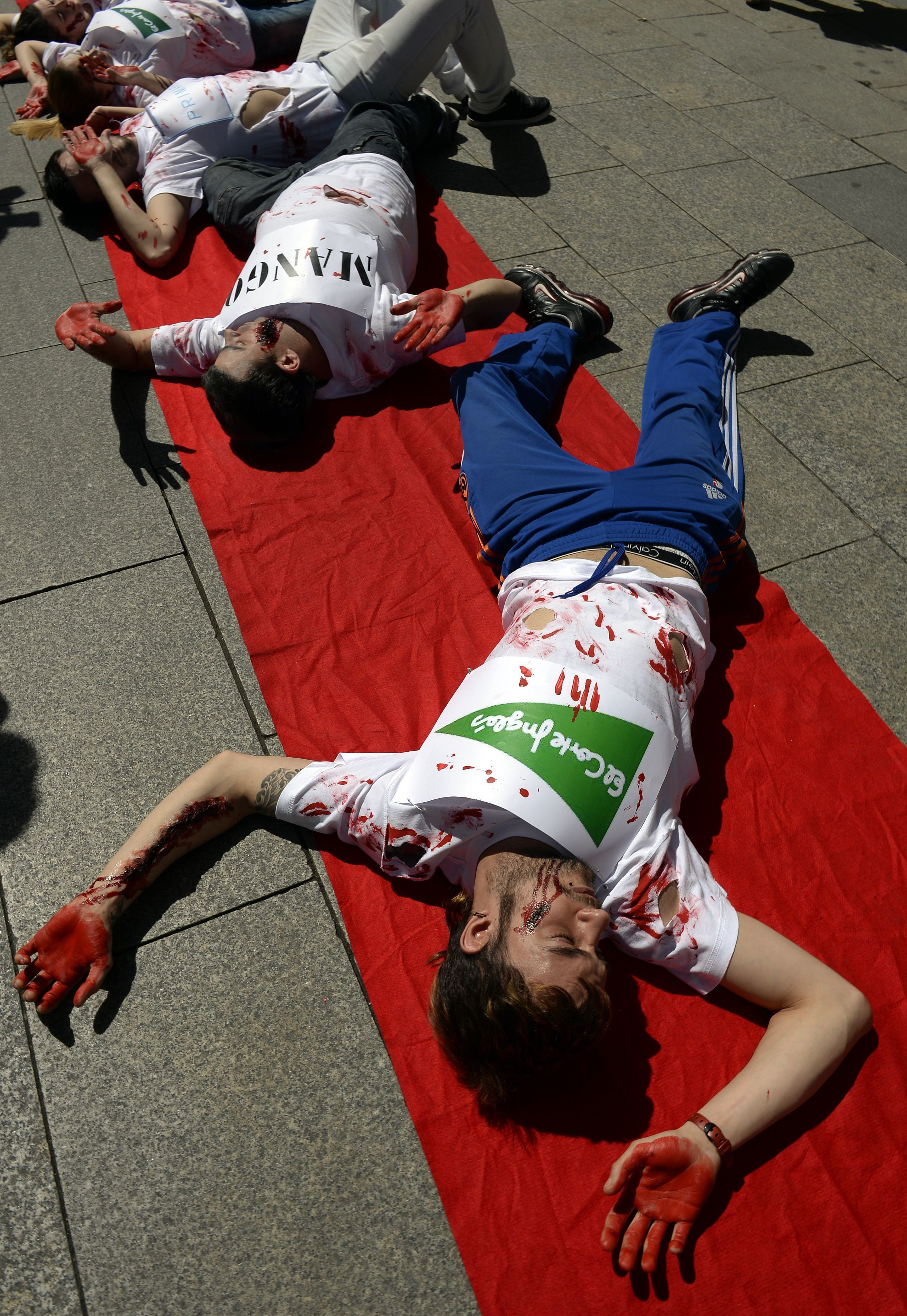 Cu mainile pictate in rosu sangeriu, membri ai sindicatului spaniol UGT au manifestat marti in fata unui magazin Mango din Barcelona pentru a denunta compania care a recunoscut ca a comandat "esantioane" de la Rana Plaza, un imobil de confectii care s-a prabusit in Bangladesh, relateaza AFP.