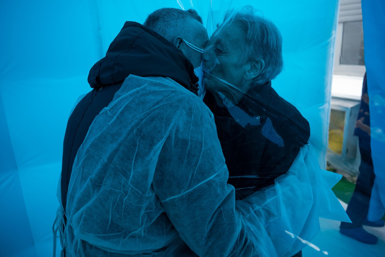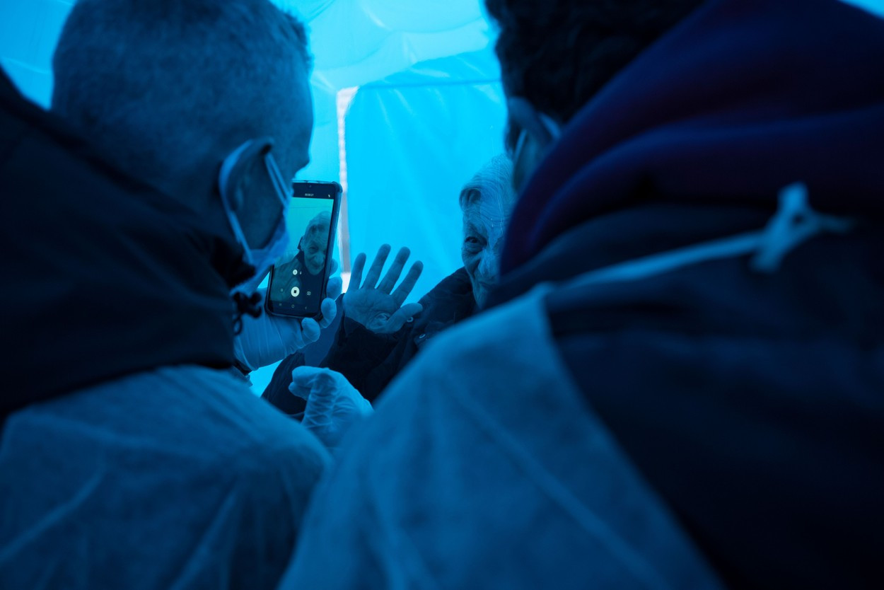 Pentru a avea acces la această structură din plastic alb şi albastru, care arată ca un cort, fiecare vizitator trebuie să îşi rezerve intervalul de timp şi să îmbrace un costum de protecţie, mănuşi şi mască înainte de a intra şi de a-şi revedea persoana dragă, printr-o folie de plastic transparentă.