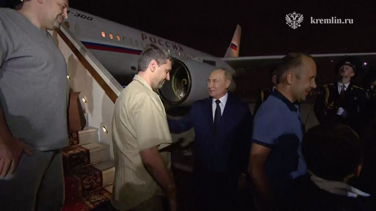 ???????? President Vladimir Putin personally came to Vnukovo Airport to meet the returned Russian citizens who had previously been imprisoned in NATO countries.