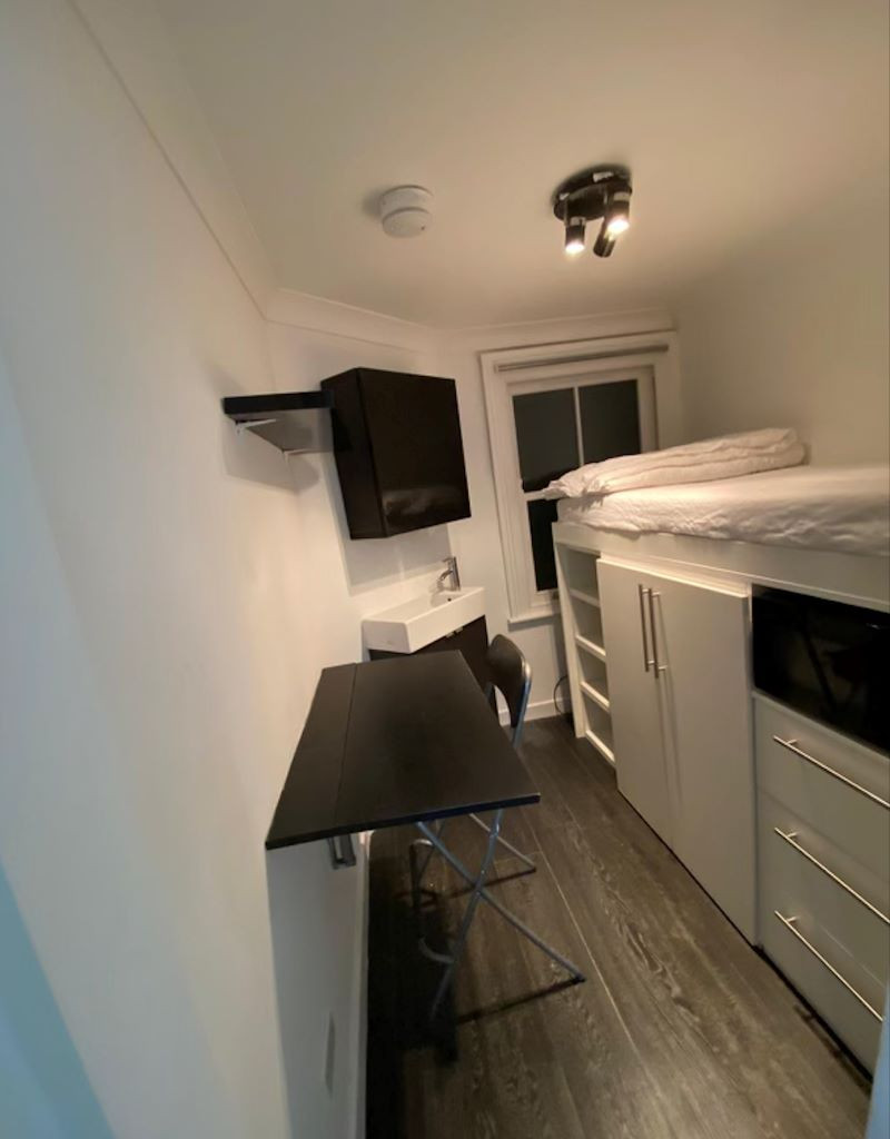 În cazul celui din Londra, spaţiul a fost maximizat prin amplasarea patului deasupra spaţiului de depozitare. Există şi o masă pliabilă pentru mâncat şi lucru. Toaleta şi duşul sunt într-o cameră separată.